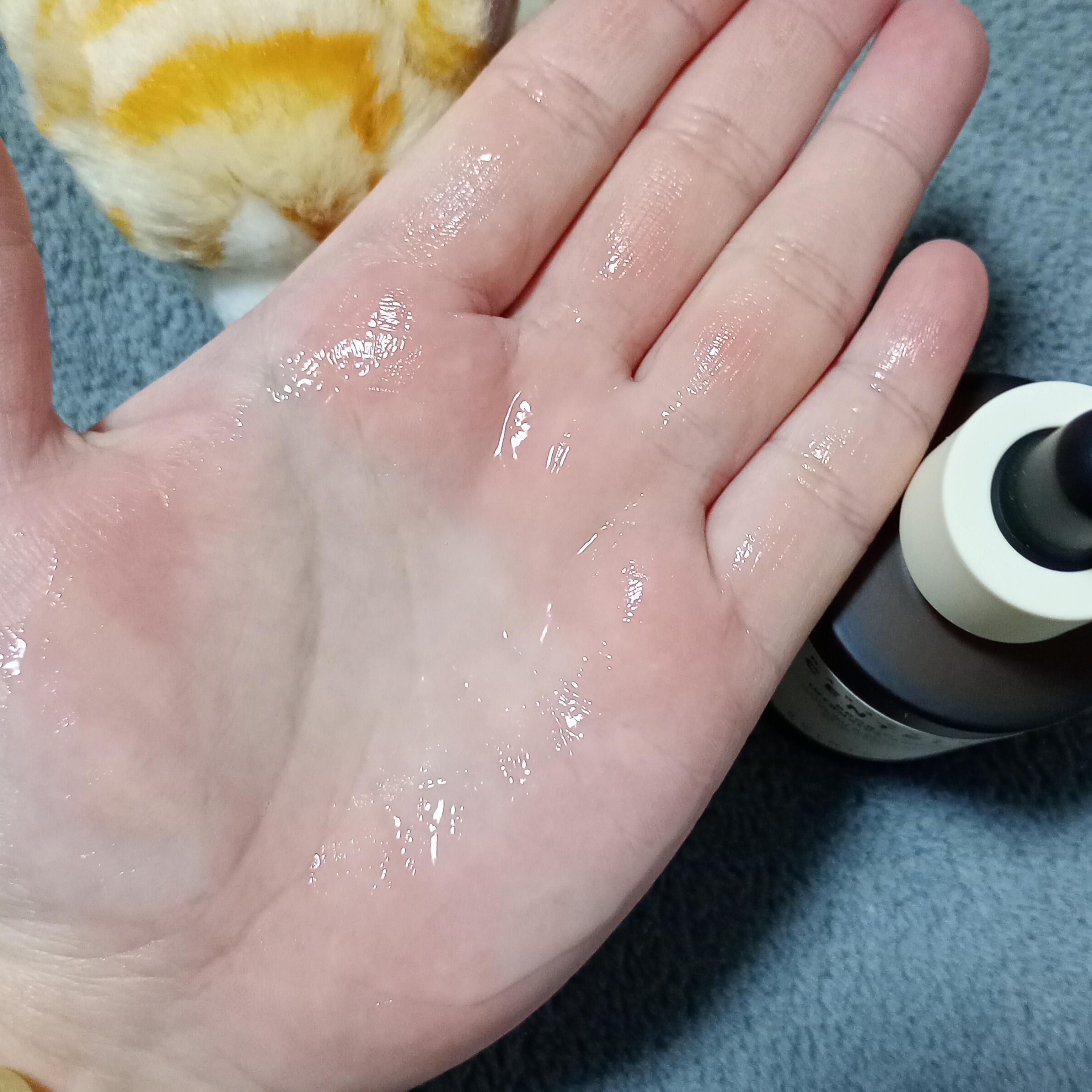 透明のジェルで固めのテクスチャー。かなり粘度の高いことが写真から分かるでしょうか?ハチミツとか水あめくらい濃厚です!! お肌に付けると温かさも感じます。 伸びは良くないですが使いにくいと思った場合は導入ローションを使うと良いです