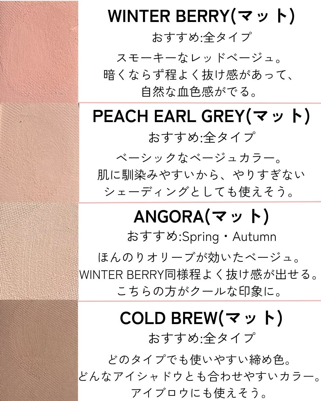 やっぱりくすみピンク系のアイシャドウがたくさん集まる〜!肌馴染みが良いのに自然な華やかさがでるのが好きなのです。 普段使いにもお出かけメイクにもどっちにも使えるし、地味顔が華やぐし、かなり好き。 真ん中だけじゃなくて、全色かわいいから捨て色なしなのよ。大抵パレットだと滅多に使わない色って1色くらいはあるけど、これは珍しく全部ハマった。
