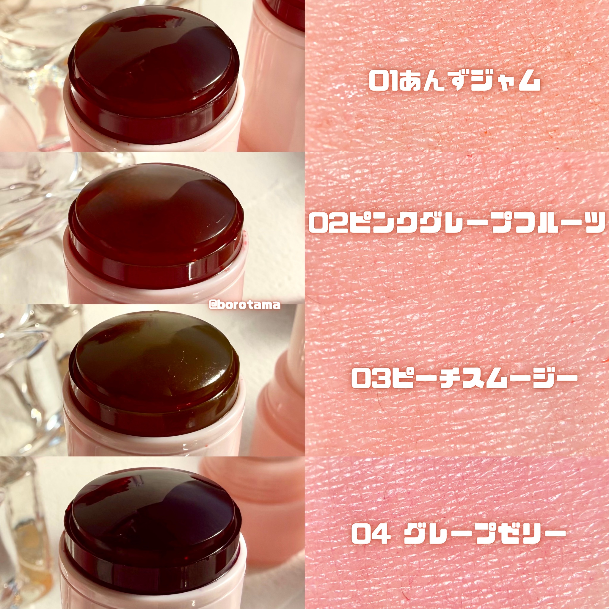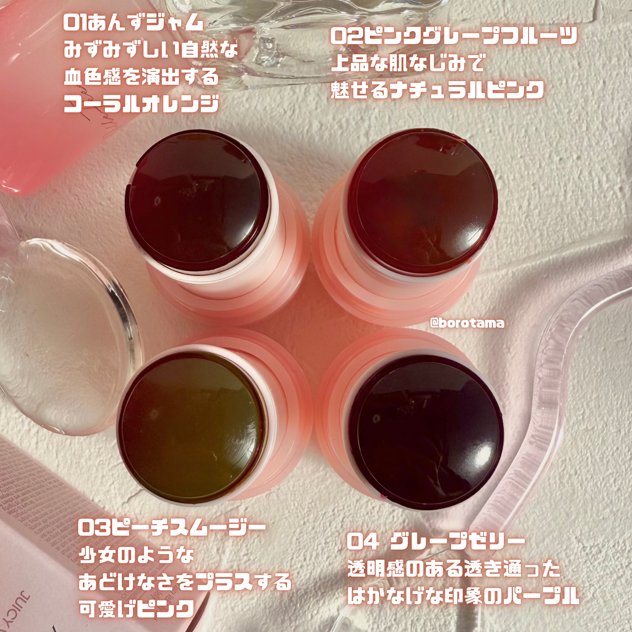 - ・ぷるぷる質感のチークにもリップにも使えるティント ジェリーのようなぷるぷる質感が新しいティント。 薄づきでぼかしやすいみずみずしいテクスチャーが特徴で、簡単に自然な血色感を演出できます。チークには1~2回、リップには3~4回直接ポンポンするのがおすすめ。 ・やわらかい発色で自然な血色感が夜まで続く ふんわりジュワッと、ツヤとマットのいいとこ取りのような仕上がりで、湯上がりのように素肌が火照っているような自然な血色感を演出できます。 色持ちも抜群で、普段メイクに重ねたり、ベースメイクに仕込むことで時間が経っても色が残りやすくなります。 様々な活用方法をお試しください。 01 あんずジャム みずみずしい自然な血色感を演出するコーラルオレンジ 02 ピンクグレープフルーツ 上品な肌なじみで魅せるナチュラルピンク 03 ピーチスムージー 少女のようなあどけなさをプラスする可愛げピンク 04 グレープゼリー 透明感のある透き通ったはかなげな印象のパープル