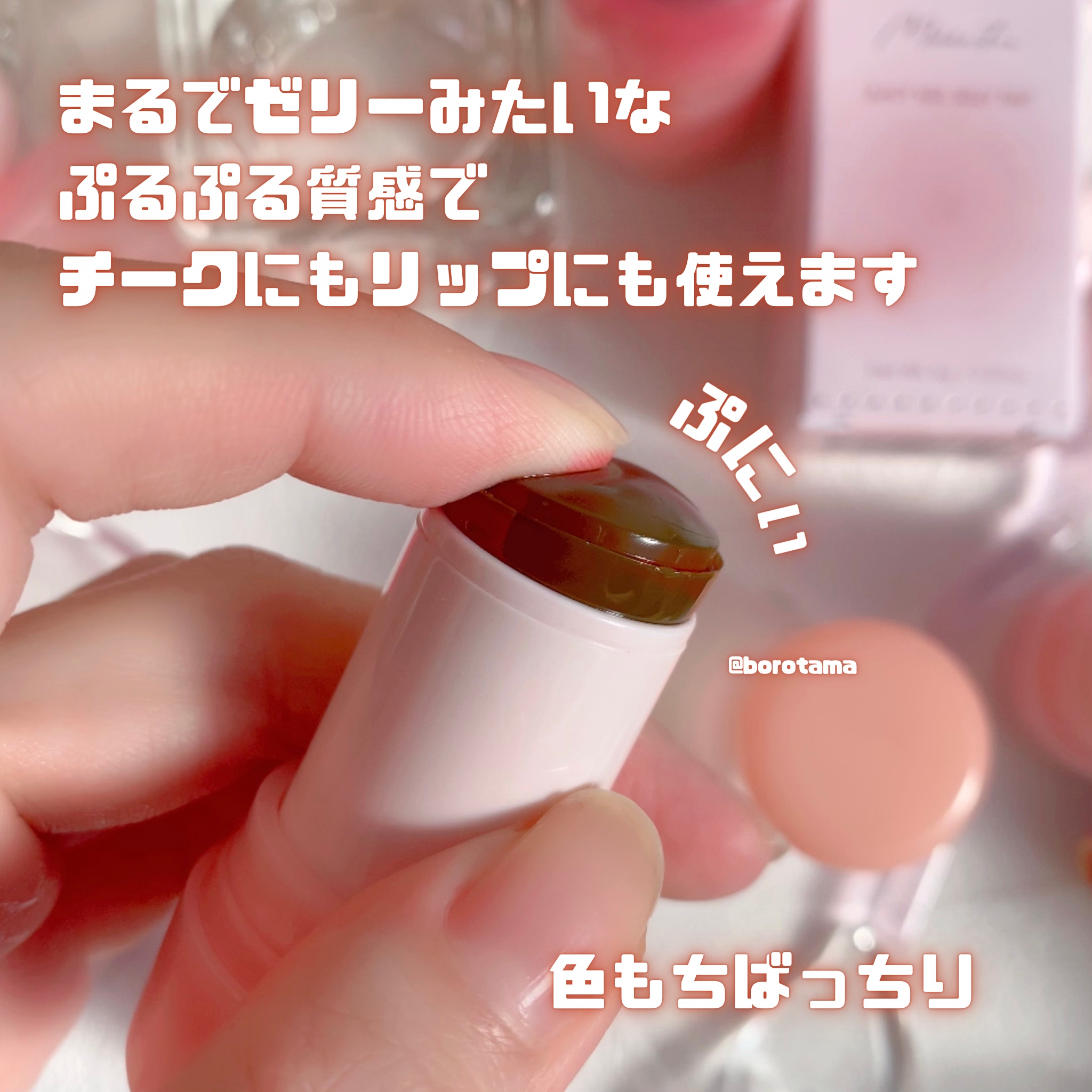ぷるぷる質感のチークにもリップにも使えるジェリーティント🫧 みずみずしいテクスチャーで簡単に血色感を演出できるよ。 朝使ったら夜までほんっと落ちにくい! ティントだからチークとして使う時はちょっとずつつけたほうが失敗しにくいよ! 絶対にメイクを落としたくない!という時におすすめ❤️