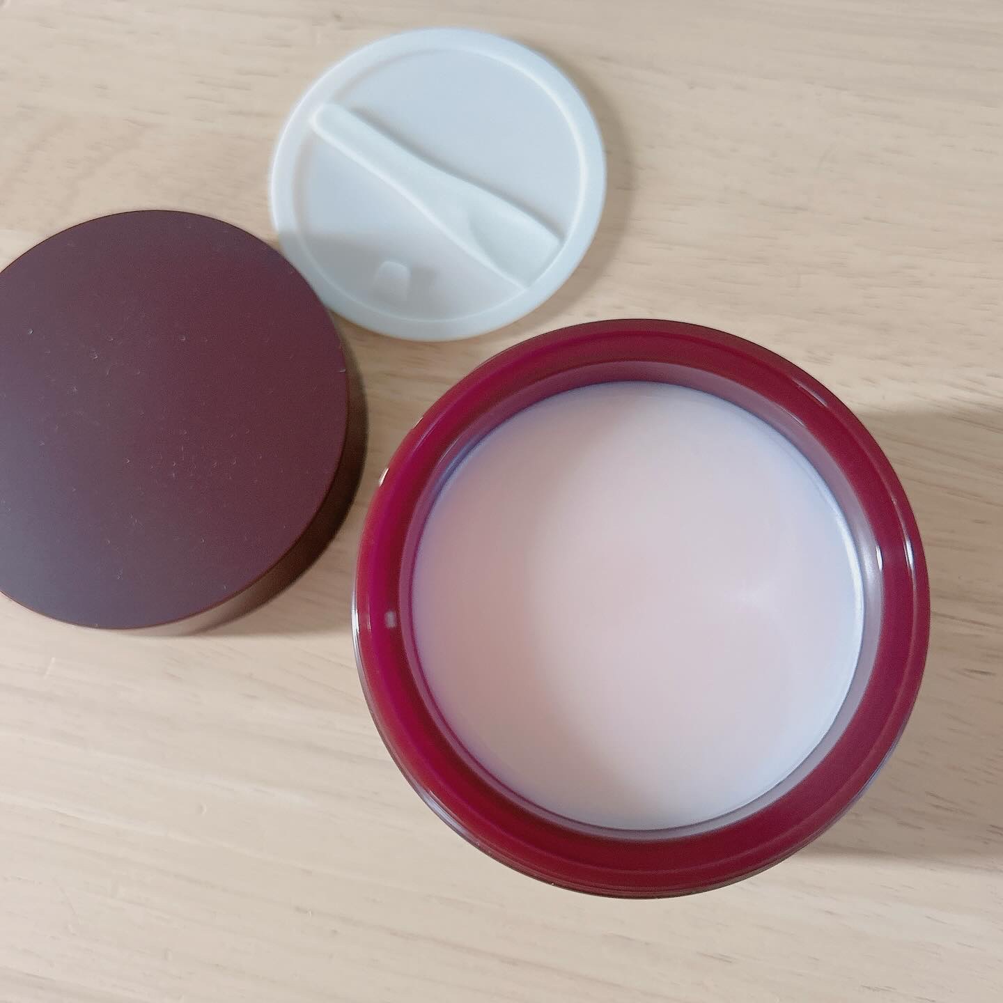 ジェルはさらっと塗れて塗りやすいです。 軽すぎず重たすぎずな使い心地☻ しっとりではあるけどしっとりしすぎずで 1個で十分なくらいです𓂃୨୧ もしかしたら乾燥しやすいこれからの季節はプラスに必要かもしれませんが 今のところなくて大丈夫でした◎ 疲れた夜にも使ってみましたが、 翌朝までしっとりしてくれました⋆︎* スパチュラや内蓋はありません𓂅 内蓋はないけどペラペラとした被せたものはありましたが⍤ 使い心地といい1000円以下の高コスパなので全然許せます← 笑
