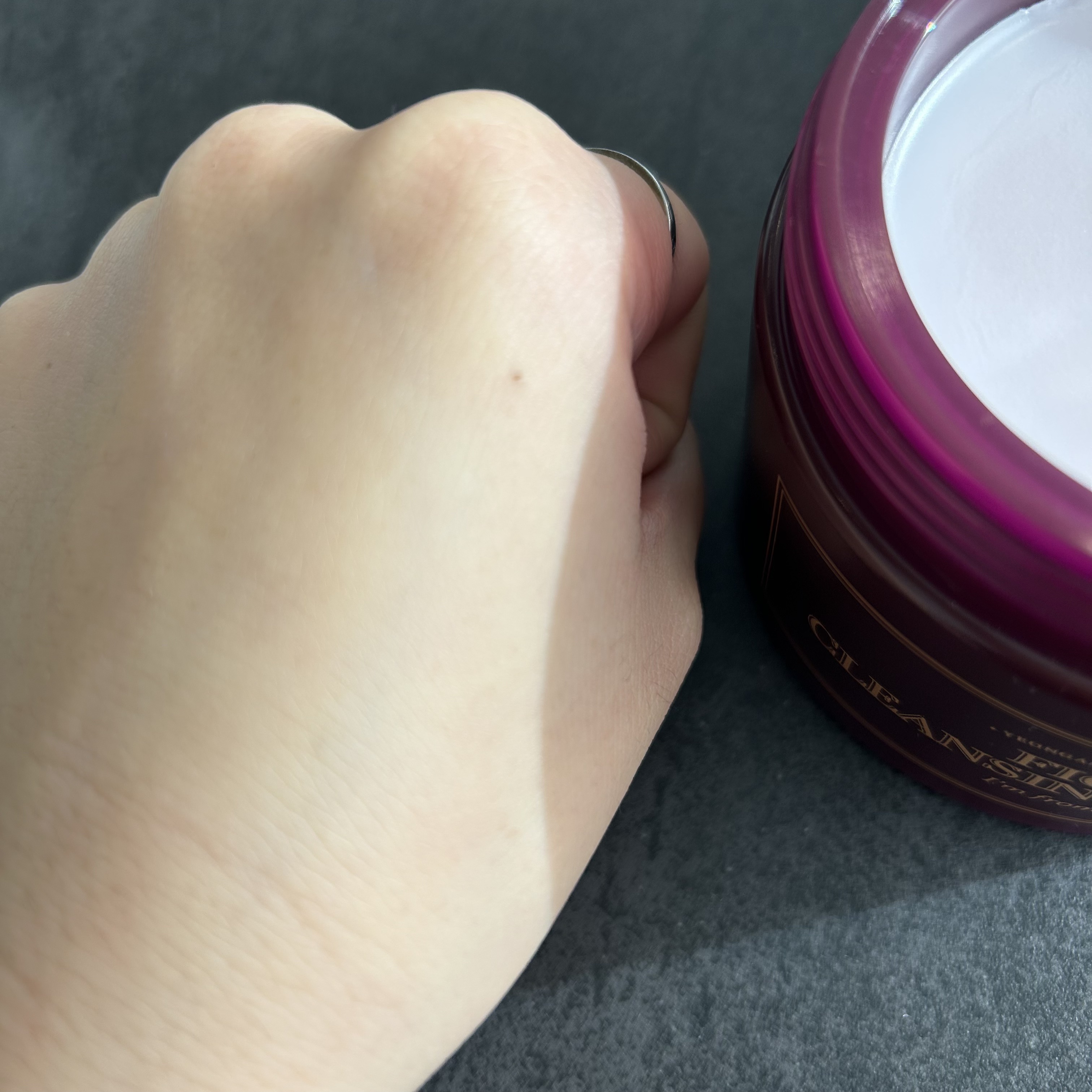 濃いめのメイクを想定してのメイク落としにチャレンジするよ!シャーベット状の柔らかいバームで薄ピンク色してて可愛い♡また伸びがすごく良いのでメイクとの馴染みも早い🙆♀️ これひとつでメイクオフから角質&毛穴ケア、そして保湿までおまかせ︎︎👍「イチジクオイルウォーター」が溶けて角質やブラックヘッドにアプローチ! 気品のある香りでクレンジングしながらリラックス効果も♡フィグシリーズは、ディープパープル色のパッケージでオシャレで大好き❤