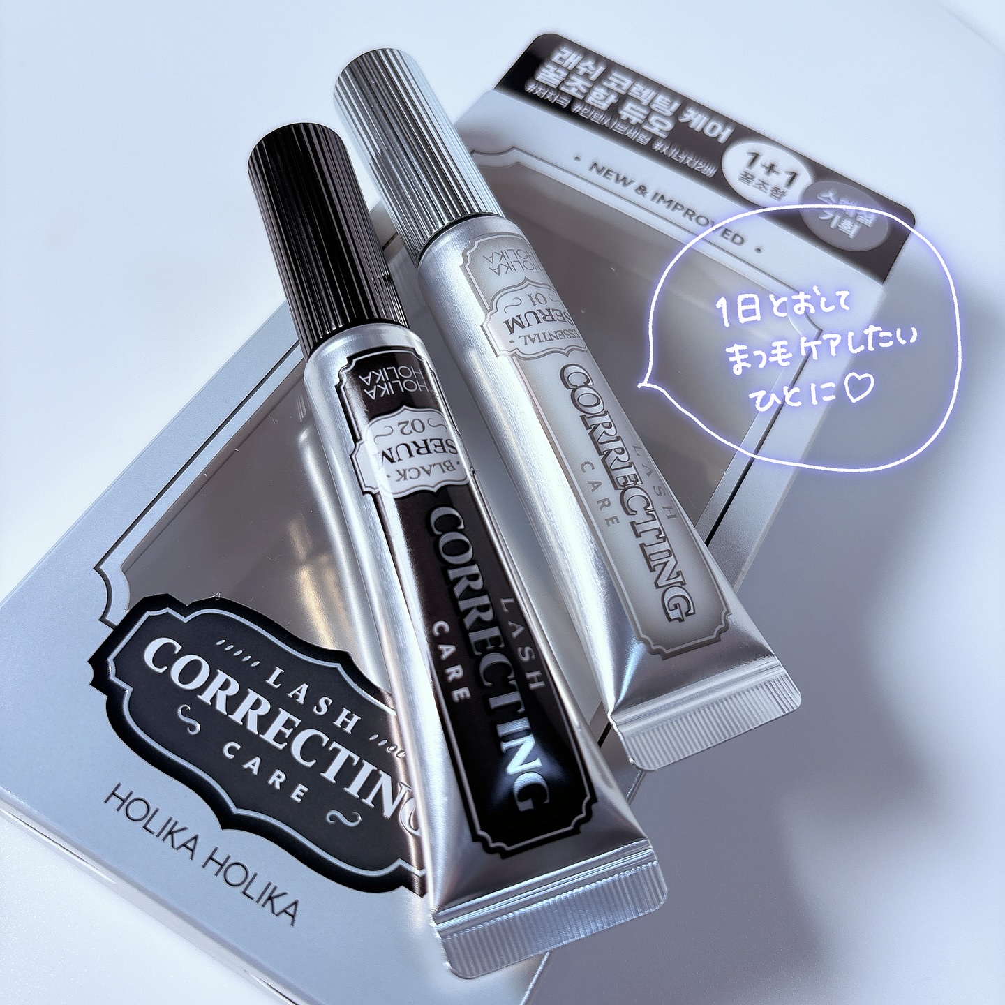 大好きなHOLIKA HOLIKA🍭 ラッシュコレクティングケアベスト組み合わせ企画セットだよ🥰 (エッセンシャルセラム+ブラックセラム) ブラックセラムは日中でもケアしながらナチュラルに仕上げられる! オイルフリーでまつエクやまつげパーマにも使えて、お湯で落とせるのが嬉しいポイント!