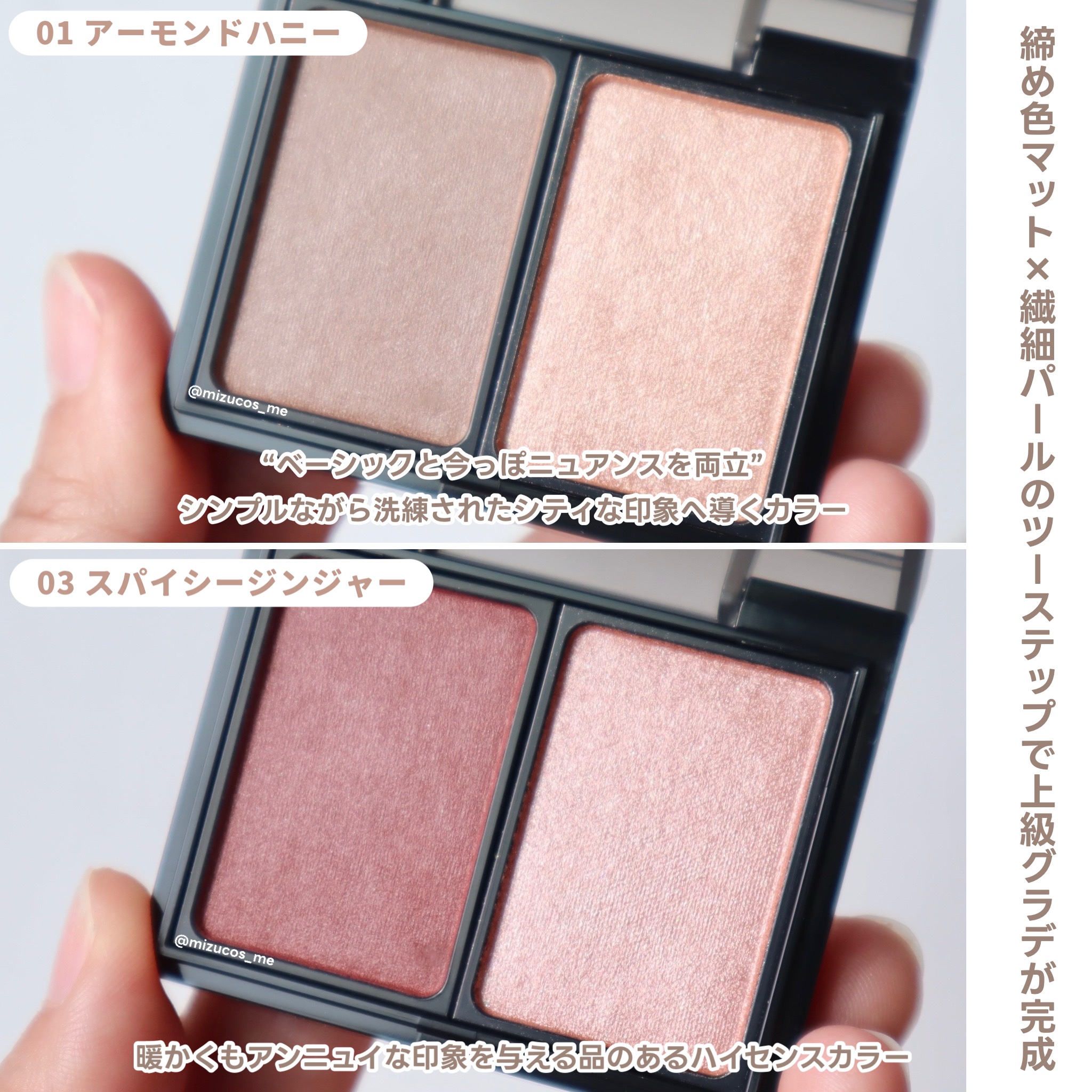 時短・簡単・トレンド感をテーマにしたかじえりちゃんイチオシの2色アイシャドウ。 スパイシージンジャーは〝+3℃の血色感〟を与えてくれる暖かくもアンニュイな印象を与える品のあるハイセンスカラーだそうです。 2色アイシャドウって簡単にグラデーション仕上げにできるので嬉しい🥰