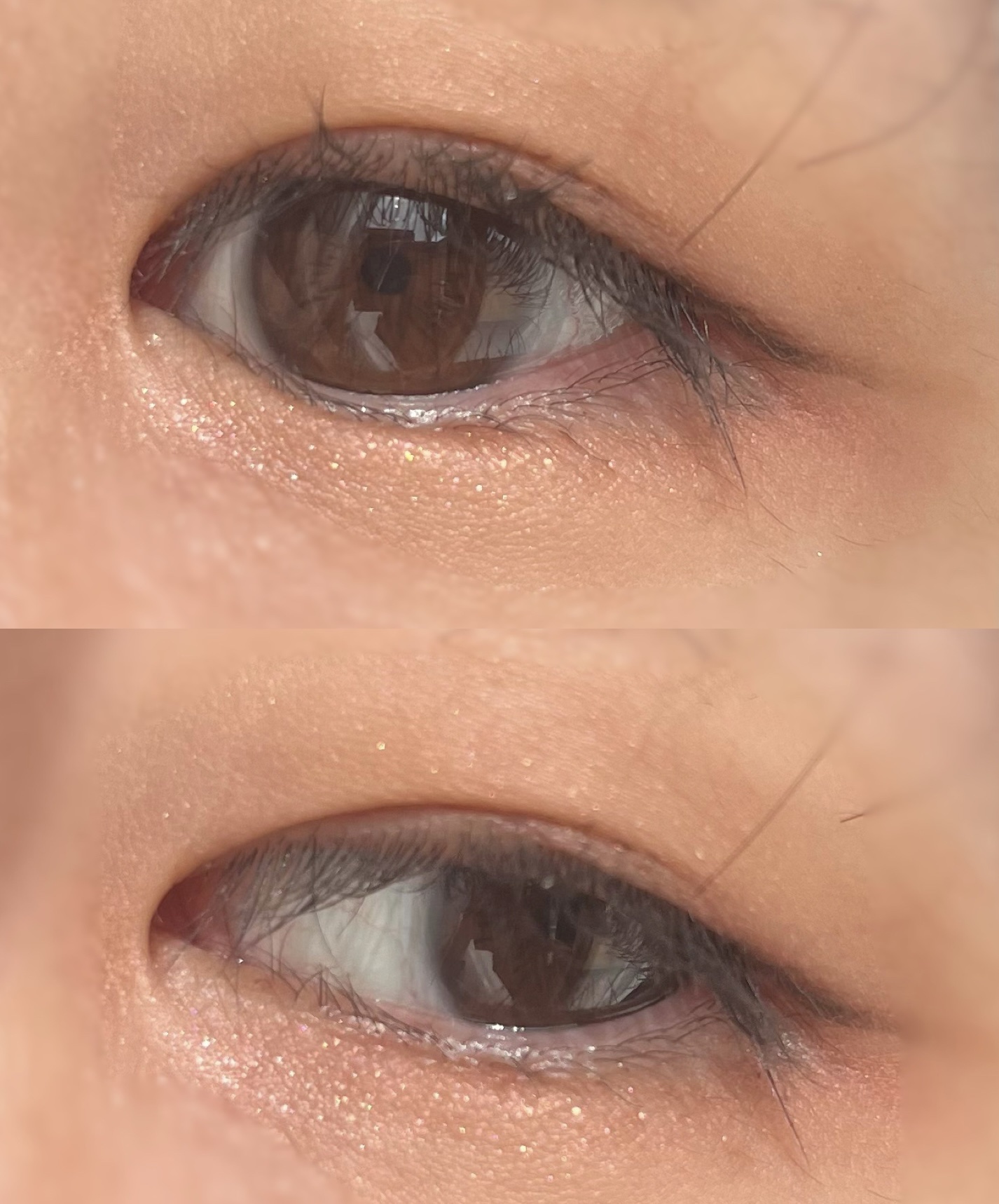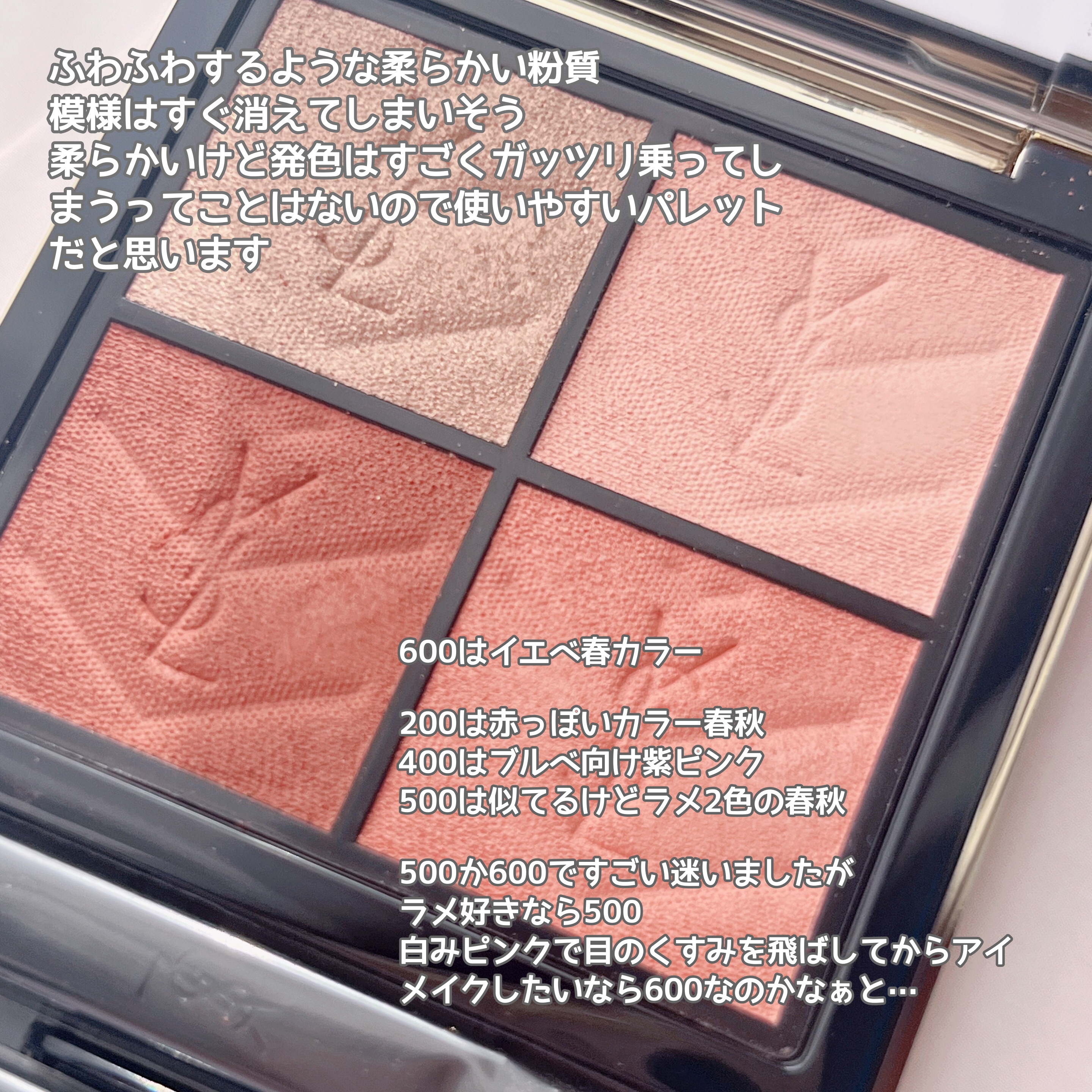 暖かみのあるソフトピーチ🍑 しっとりとしたテクスチャー。肌に密着しているように感じ、粉飛びは気になりませんでした。 左上ラメ ベージュブラウンにピンクとゴールドラメがキラキラして可愛い🫶 全体的にあたたかみのある色なので、イエベが得意な色かなと思いました。