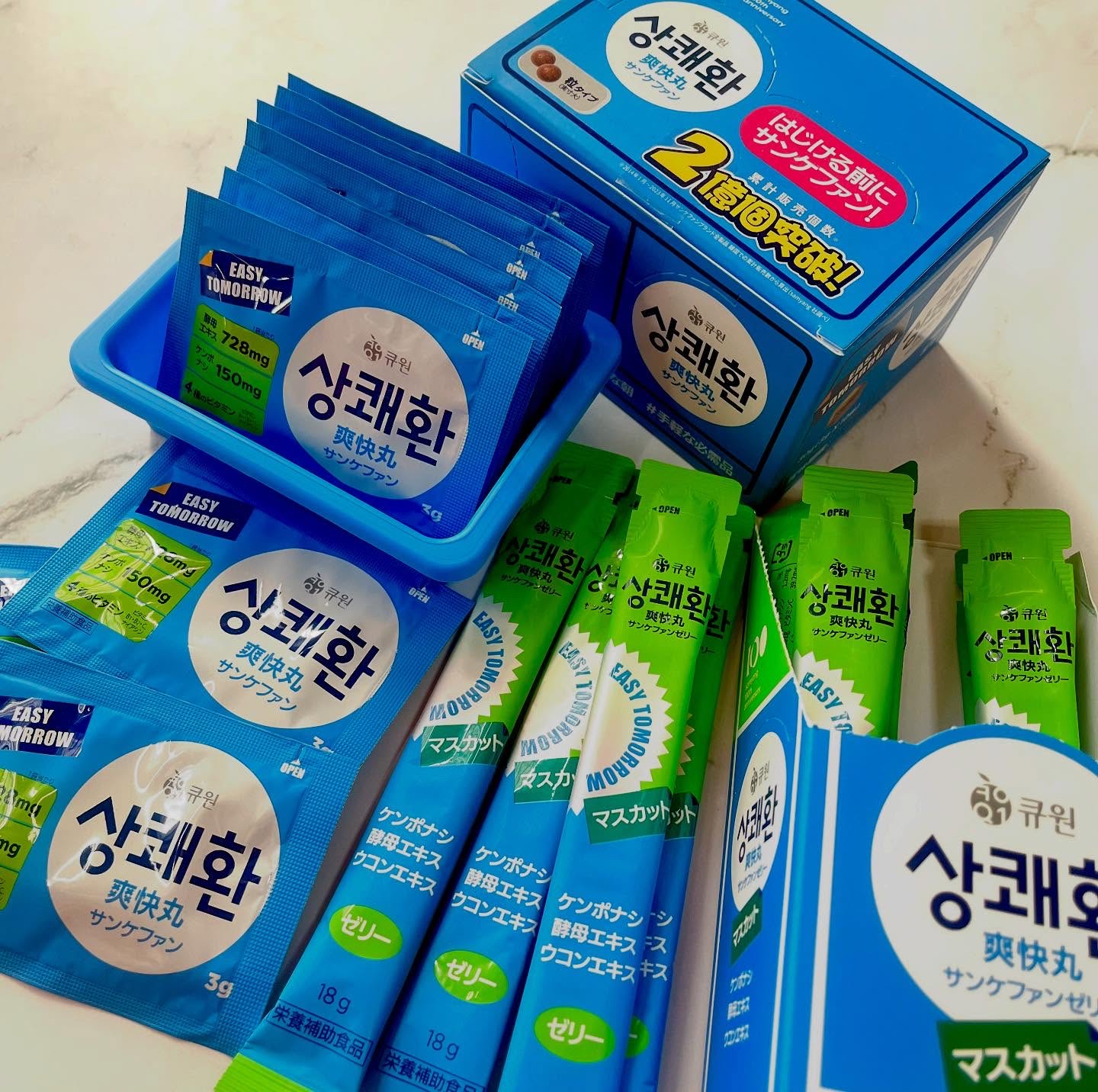 翌朝すっきり爽快に過ごすために✨ 韓国の二日酔い対策ではケンポナシが定番で、1度はお世話になってる人も多い サンケファンはそんな悩みをサポートしてくれる次世代ウコンであるケンポナシと酵母エキス(グルタチオン含有)配合で、美容×二日酔い対策といった目新しさもあり、救世主のようなお守り的存在🪬 苦手な人はスルッと食べやすいゼリータイプ!何よりマスカット味で美味しいし、水なしでその場でパクッと手軽に二日酔い対策できるのがおすすめ🥰