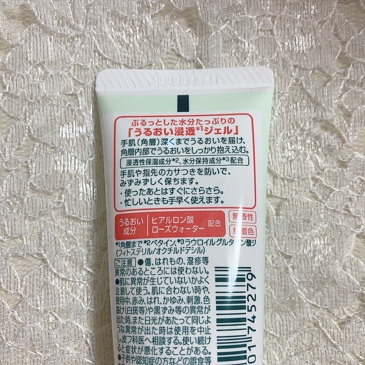 - ぷるっとした水分たっぷりの「うるおい浸透*1ジェル」。 手肌(角層)深くまでうるおいを届け、角層内部でうるおいをしっかり抱え込む。 浸透性保湿成分*2、水分保持成分*3配合。 手肌や指先のカサつきを防いで、みずみずしく保ちます。 使ったあとはすぐにさらさら。忙しいときも手早く使えます。 ●うるおい成分(ヒアルロン酸・ローズウォーター)配合 ●無香性、無着色 *1 角層まで *2 ベタイン *3 ラウロイルグルタミン酸ジ(フィトステリル/オクチルドデシル)