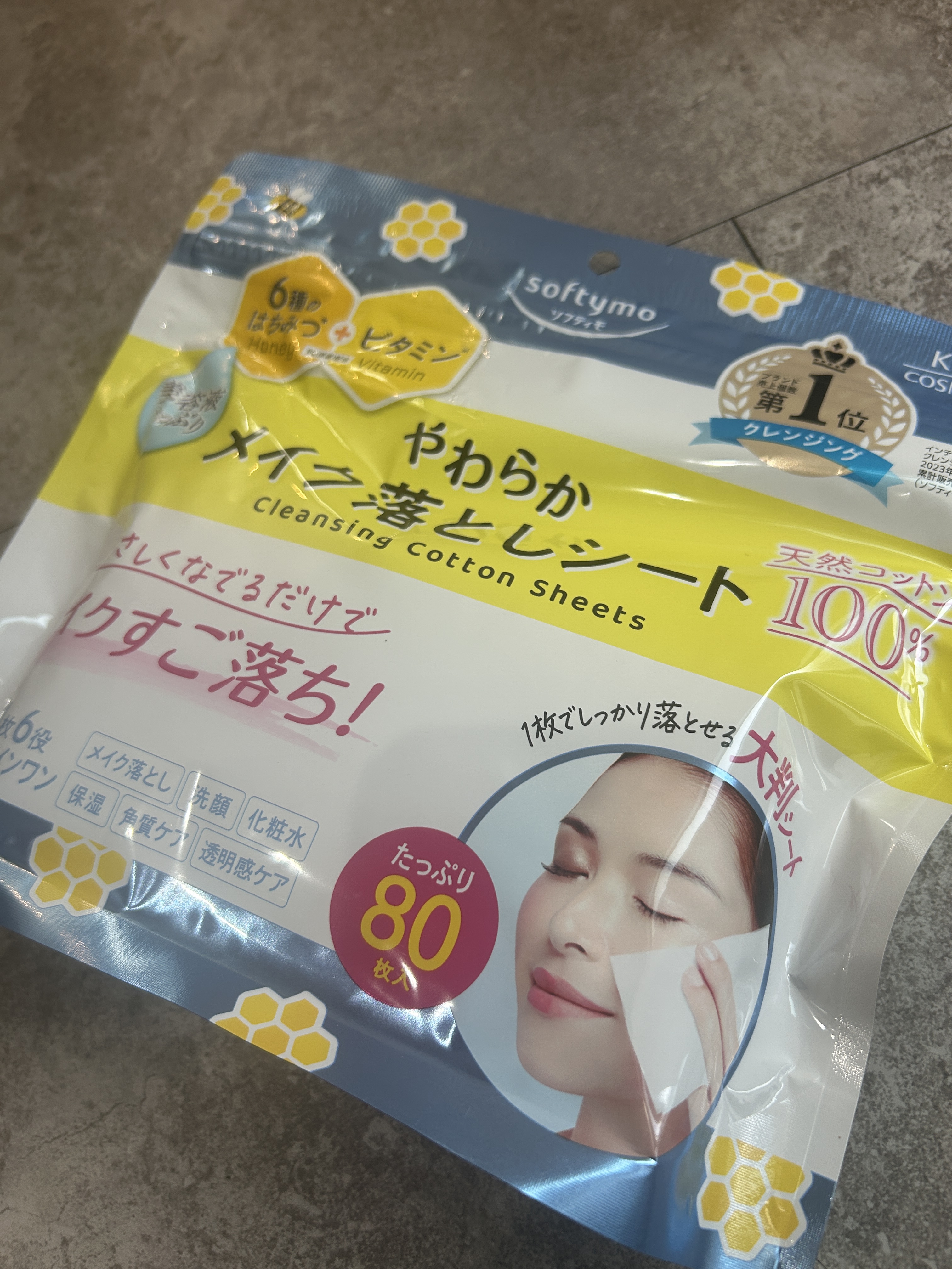 やさしくなでるだけでメイクをしっかり落とす、オールインワンクレンジングシートです。メイク落とし、洗顔、化粧水、保湿、角質ケア、透明感ケアの6役のクレンジングコットンシート。 1枚でしっかり落とせる大判タイプで、たっぷり使える大容量80枚入なのもうれしいです。 やや薄めのシートで、やわらかい肌触りです。シトラスハニーの甘く爽やかな香り。