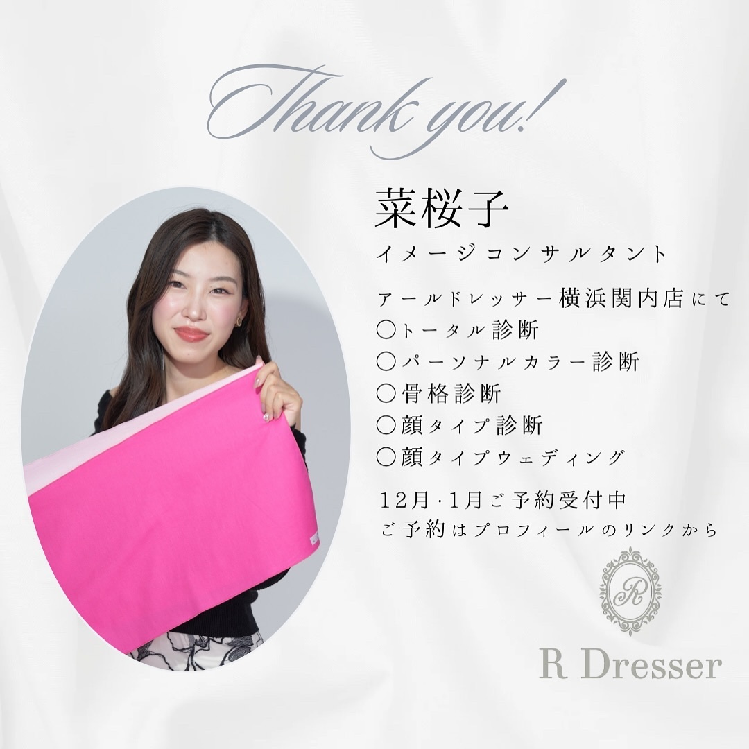 月間1000名以上(年間10,000人以上) イメージコンサルティングサロン R Dresser(新宿/銀座/横浜/梅田/福岡)ではご予約を随時受け付けております 人気メニュー 16タイプトータル診断180分 (パーソナルカラー・骨格・顔タイプ) 32,000円 ご指名も可能です ▼菜桜子(横浜関内店)▼ @r.dresser_naoko ご予約お待ちしております🪞✨