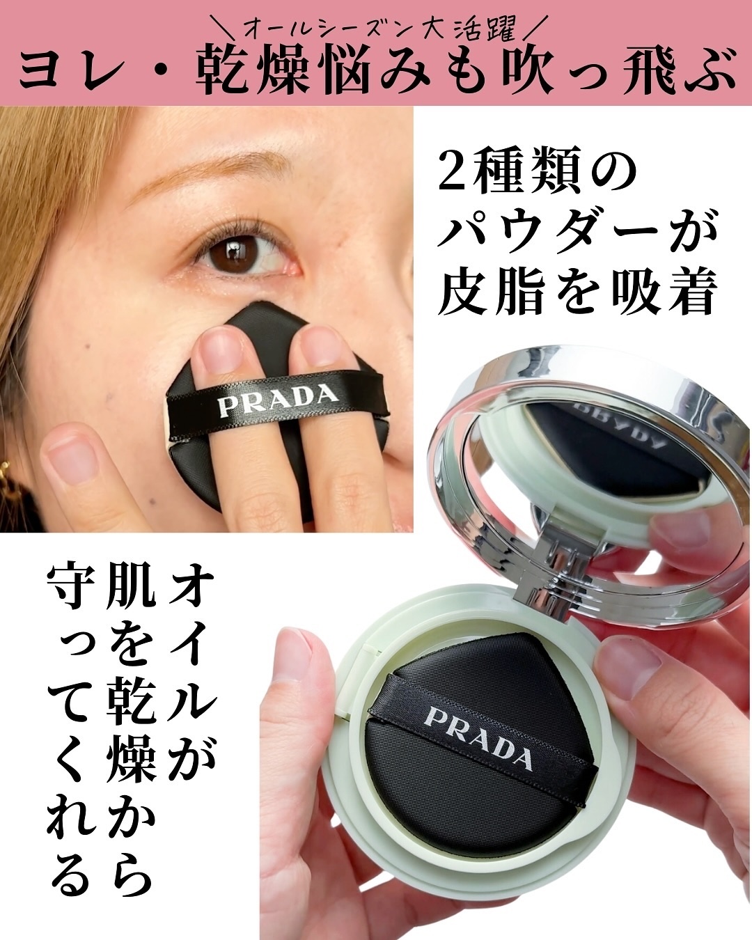 見た目で買いたくなる♡ Prada Re-Nylonを贅沢に施したコンパクトがおしゃれ♡ でも、、仕上がりにはもっともっと感動するはず🥺 1つ1つオイルでコーティングされたピグメントが肌に密着。柔軟テクスチャも肌の動きにフィットしてくれるから肌悩みをカバーするのみではなく、美しい仕上がりもキープ! おまけにナイアシンアミドなどのスキンケア成分も配合している贅沢美容液クッションファンデ!!