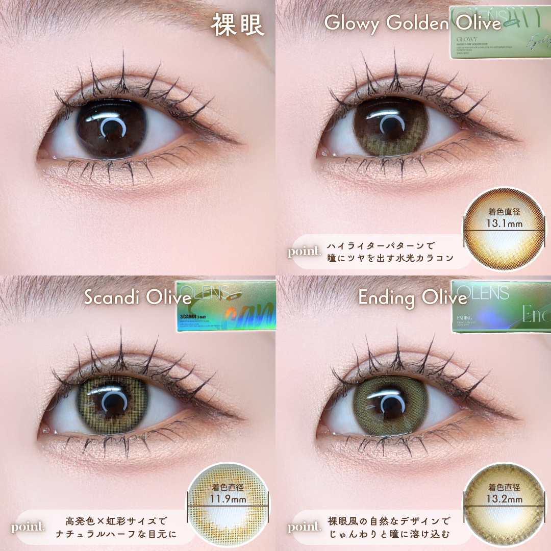 このオリーブはコスプレ感もなく使えて、浮かずに馴染むから可愛いよーー🍀 やっぱりGlowyが1番すき。 裸眼風に溶け込み神秘的な印象しっかりオリーブ感だしたいならこれ。