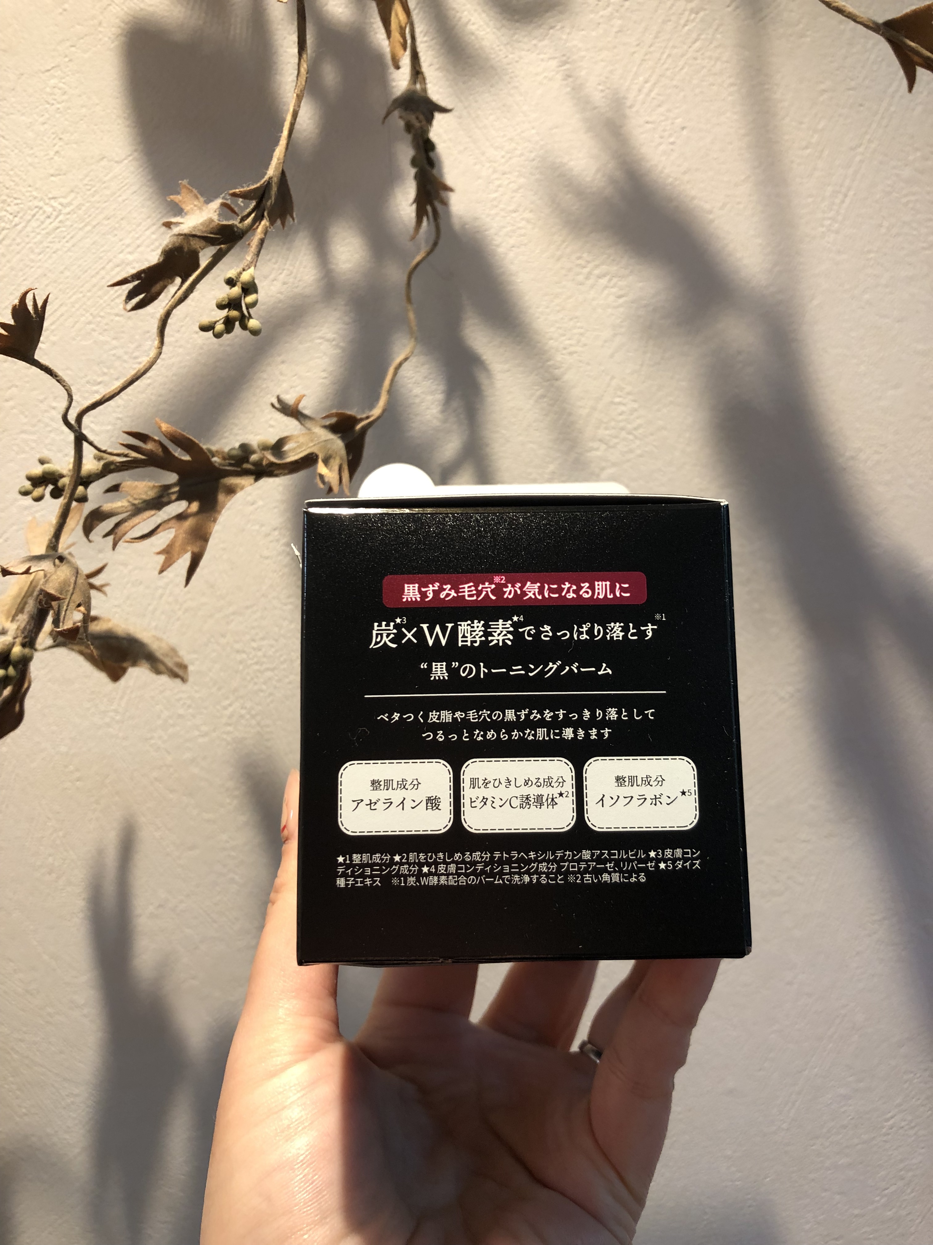 \小鼻や頬に黒ずみ毛穴にアプローチ/ ⽑⽳⽬⽴ちの原因となる⾓栓を炭とW酵素で【落とす】 ⾓栓の元となる余分な⽪脂をケアするアゼライン酸を配合で【整える】 バームが肌にのせるととけてメイク、毛穴汚れも落としてくれるのに、クレンジング後の突っ張り感もなくて使用感は良かったです。