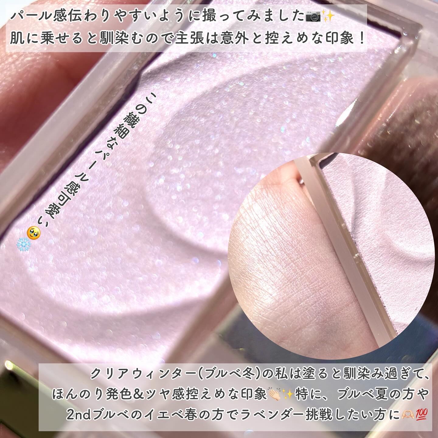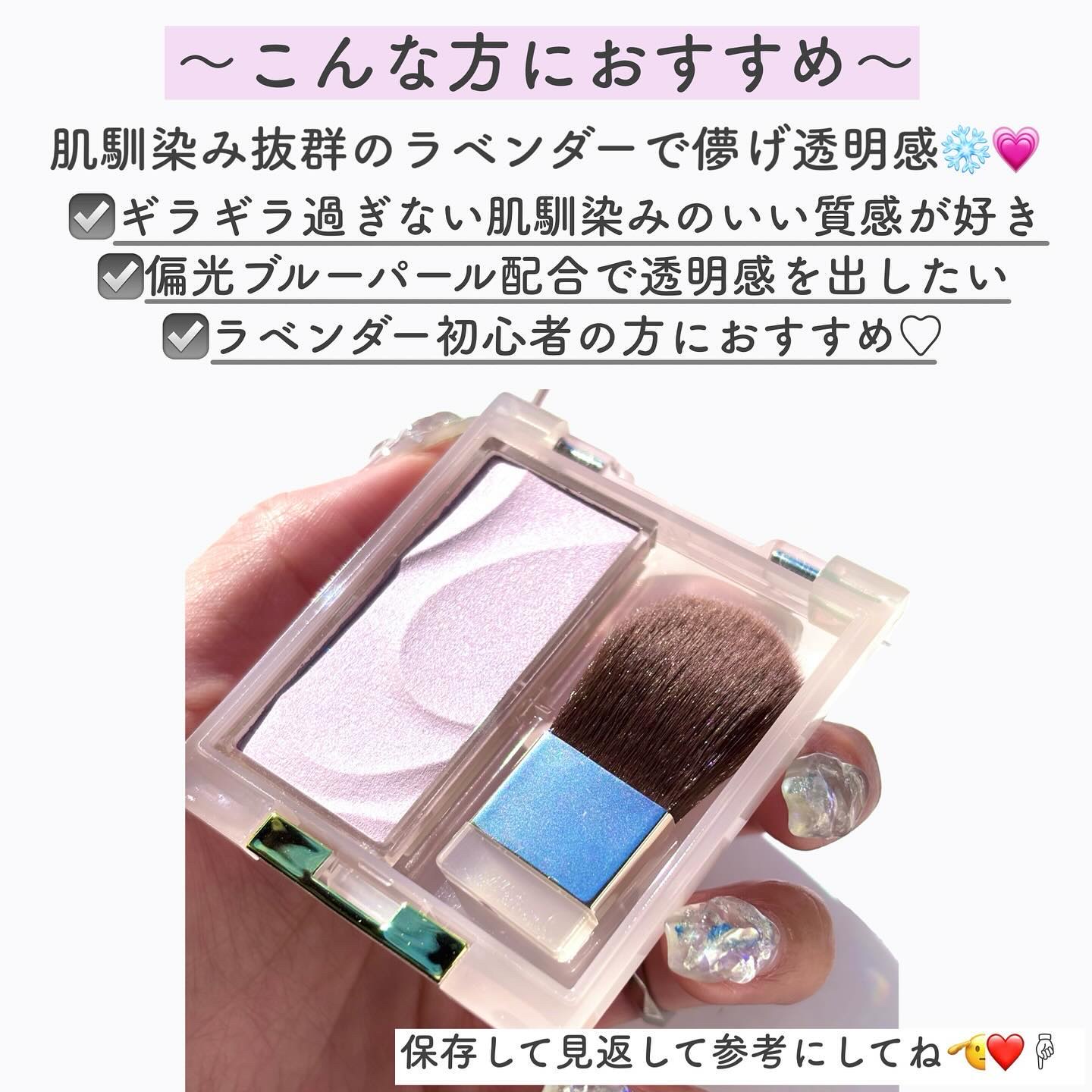 血色感と透明感が手に入る 絶妙な色がかわいい🩷 全ブルベに推したいです✨ ピンクのような紫のようなお色で発色が良すぎないので初心者さんにもおすすめ! 頬に乗せると毛穴も目立ちにくく、特に乾燥も気にならなかった🫶 この色は限定色なので気になる方はお早めに💨