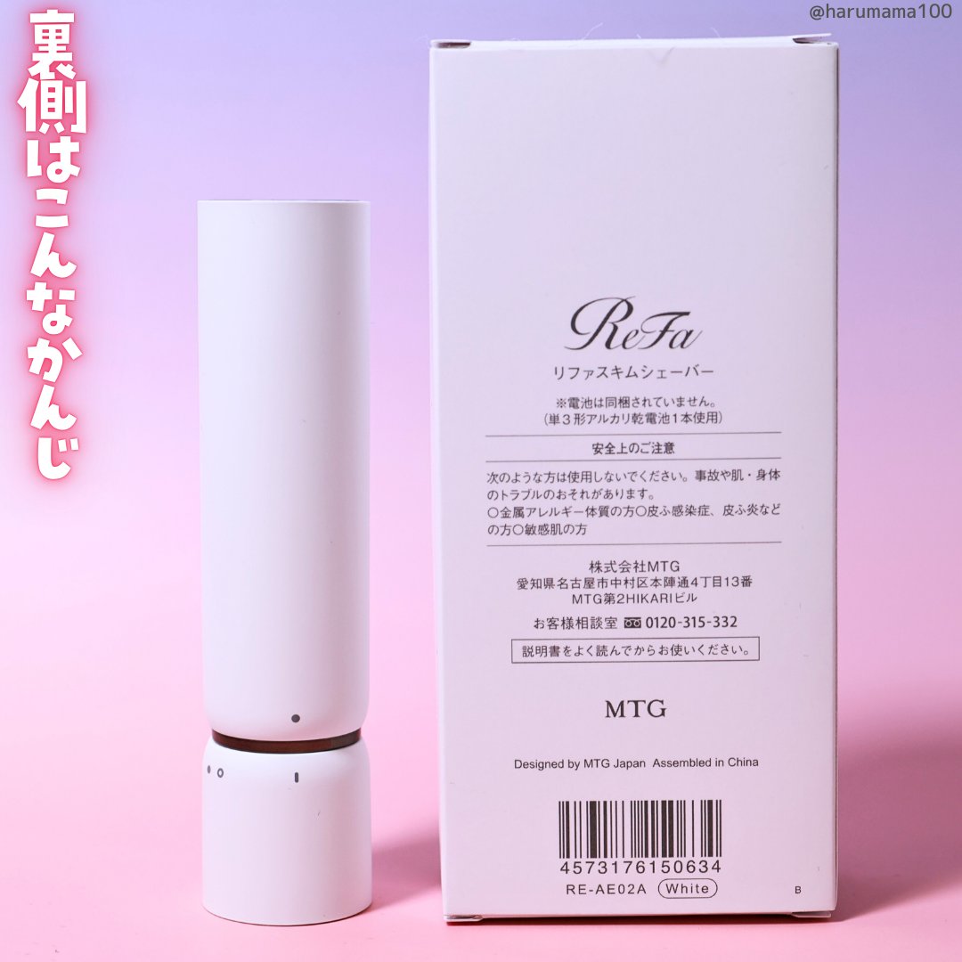 - 小さな円を描くように、やさしくすべらせるだけで 肌への摩擦による負担が少なく、うぶ毛をしっかりカット。 スキンケア・メイクアップ効果を存分に発揮するなめらかな素肌へと導きます。 いつでもどこでもトラブル*知らずのセルフシェービングを。 *トラブルとは刃が肌を傷つけることで起こるシェービングトラブルのこと 商品名 ReFa SKIM SHAVER リファスキムシェーバー 材質 ABS、ステンレス 重量 約55g 付属品 電池カバーオープナー、ブラシ、ポーチ、取扱説明書 ※電池は同封されていません。(単3形アルカリ乾電池1本使用) サイズ 約27×27×112mm 品番 RE-AE02A Refa製品の不良や故障に関しては、下記にお問い合わせください。 ================== MTGお客様お問い合わせ窓口 フリーダイヤル:0120-315-332 受付時間8:00~20:00(年中無休) ※携帯電話・PHSもご利用いただけます。 お問い合わせフォーム:https://www.mtg.gr.jp/feedback/individual_inspection.html ==================