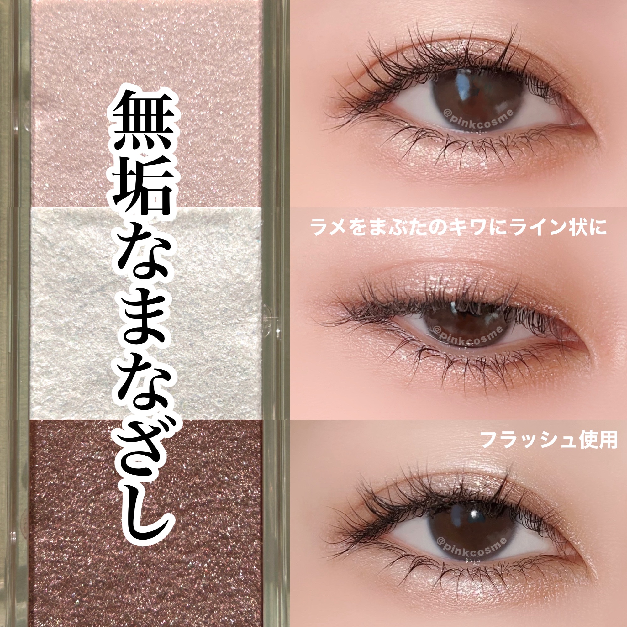 - 角度によって色が変わる高輝度偏光パールを多量配合。動くたび輝きが変化する高密着な3色入りセットアイカラー。 ● 高輝度偏光パールと大粒グリッターを贅沢に配合した、3 色セットのアイカラーです。 まぶたにしっとりとけこむようにフィットして、大粒パールやグリッターも高密着。 大胆に輝き、色気を放つ目もとがつづきます。 ● 見る角度や光の当たり具合により色味が変化する高輝度偏光パール(カラーチェンジグリッター)とクリアで高輝度な大粒グリッターを組み合わせて配合。 まばたきや動きにより色と輝きが変化する、魅力的な目もとを演出します。 ● 化粧もちを高めるフィットオイル成分配合。まぶたにピタッと密着し、パール落ちを防止。 高い透明感とツヤ感も付与し、美しい仕上がりが持続します。 ● カラーによって異なるベースを採用。 [ハイライトカラー(A)] もちっと生質感で、肌にとけこむように密着するスフレベース。 繊細なパールの輝きで、まぶたに光を取りこみ、下地効果でアイカラーの密着も高めます。 [グリッターカラー(B)] 輝きを最大限に引き出す透明性の高いベースに、高輝度偏光パールと大粒グリッターを贅沢に配合。 密着性の高いフィットオイル成分とペーストオイルをかけあわせることで、パール落ちも防止。 [アクセントカラー(C)] のび広がりのよさと高い密着性を両立して美発色を叶えたベース。 フィットオイル成分を最高量配合(パレット内比)し、粉体をコーティングすることで クリアで美しい発色と上質なツヤが持続します。 ● 無香料