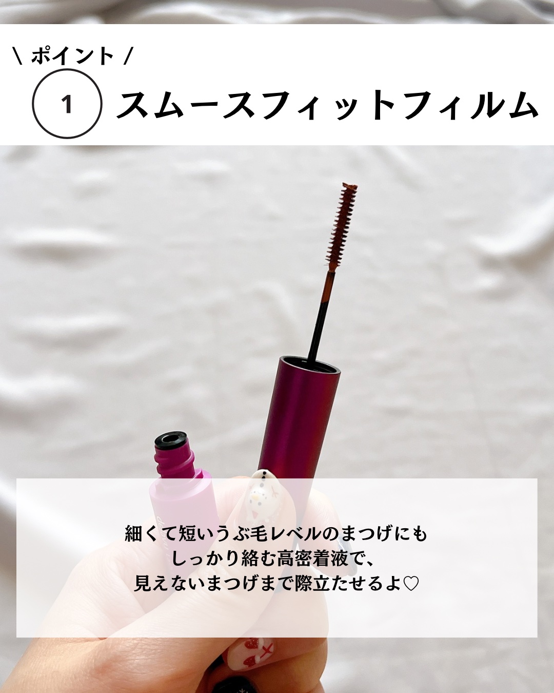 - ロングでもボリュームでもない、「自まつげを際立てる」という新発想 “見えないまつげ”も1本残らず際立てて、目ヂカラを最大限に引き出す 1.うぶ毛レベルの“見えないまつげ”も際立てる「高密着フィルム」 2.あらゆるまつげも1本残らず際立てる「超極細三角ブラシ」