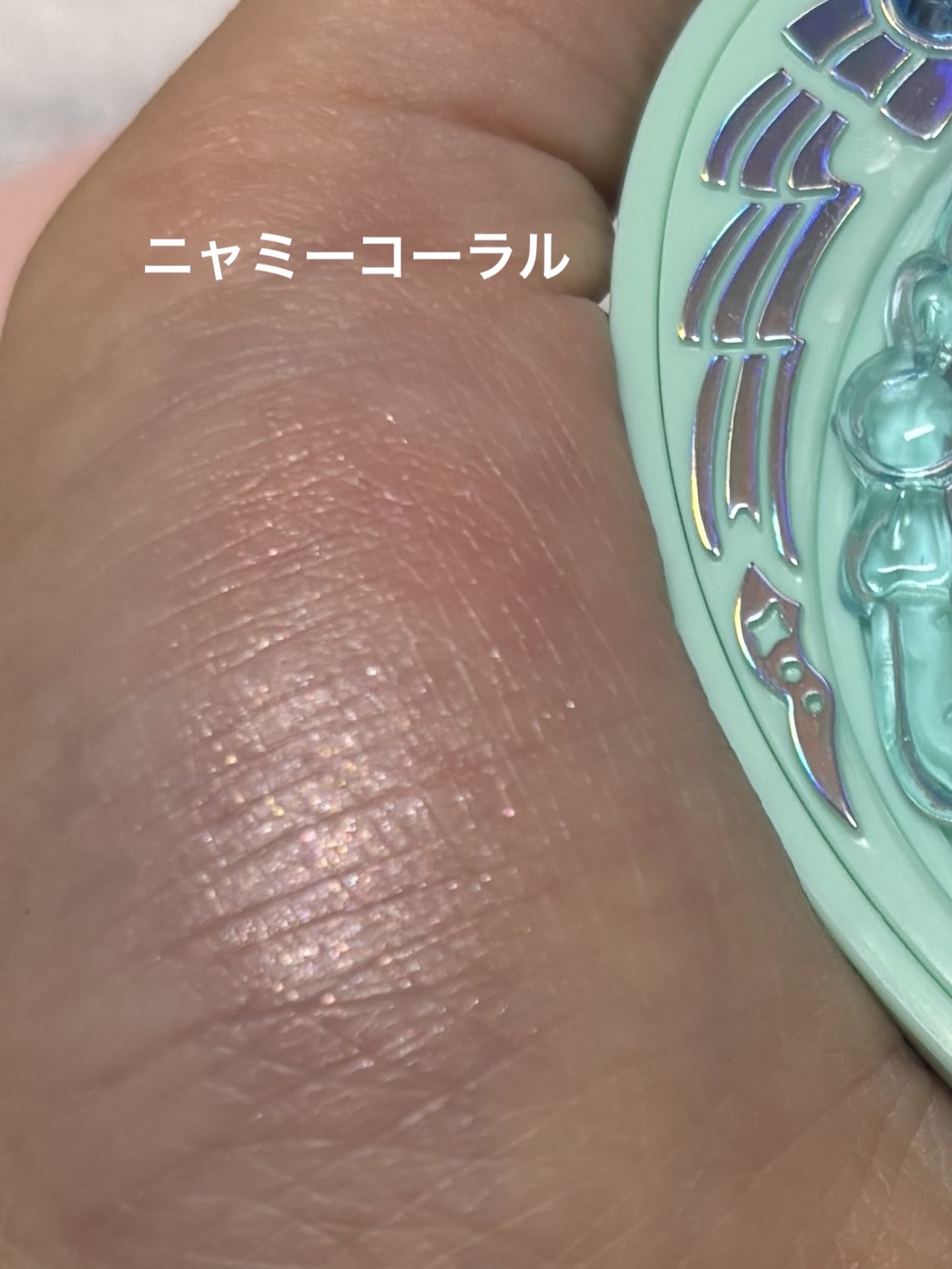 手に取って塗ってみるとグリッターよりも発色して、綺麗なパールが掛かった緑色に発色します。こちらは予想通りの発色でした。 手に塗ってみると、ピンク色に発色しました。光の角度具合によってはオレンジ色にもなります。当初の予想を大きく覆してきて驚きました。 手に塗ってみると、何ともまぁ鮮やかなパープルに発色。てっきりヤバそうな色になるだろうと予想していたのでビックリしました。