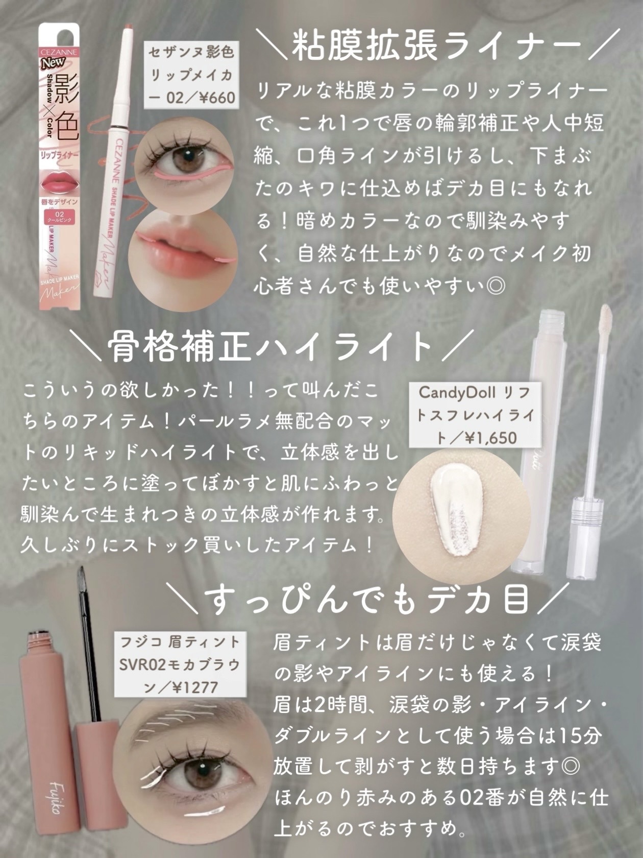 rom&nd ベターザンパレット 01PAMPAS GARDEN キャンメイク アイバッグコンシーラー 02ピンクベージュ CEZANNE ストレッチコンシーラー 30オレンジ系 これどんなに濃いクマも消える◎ やり方は画像を見てください🫶🏻 ラメを使わずに盛りたい時や、あざとく盛りたい時におすすめ!