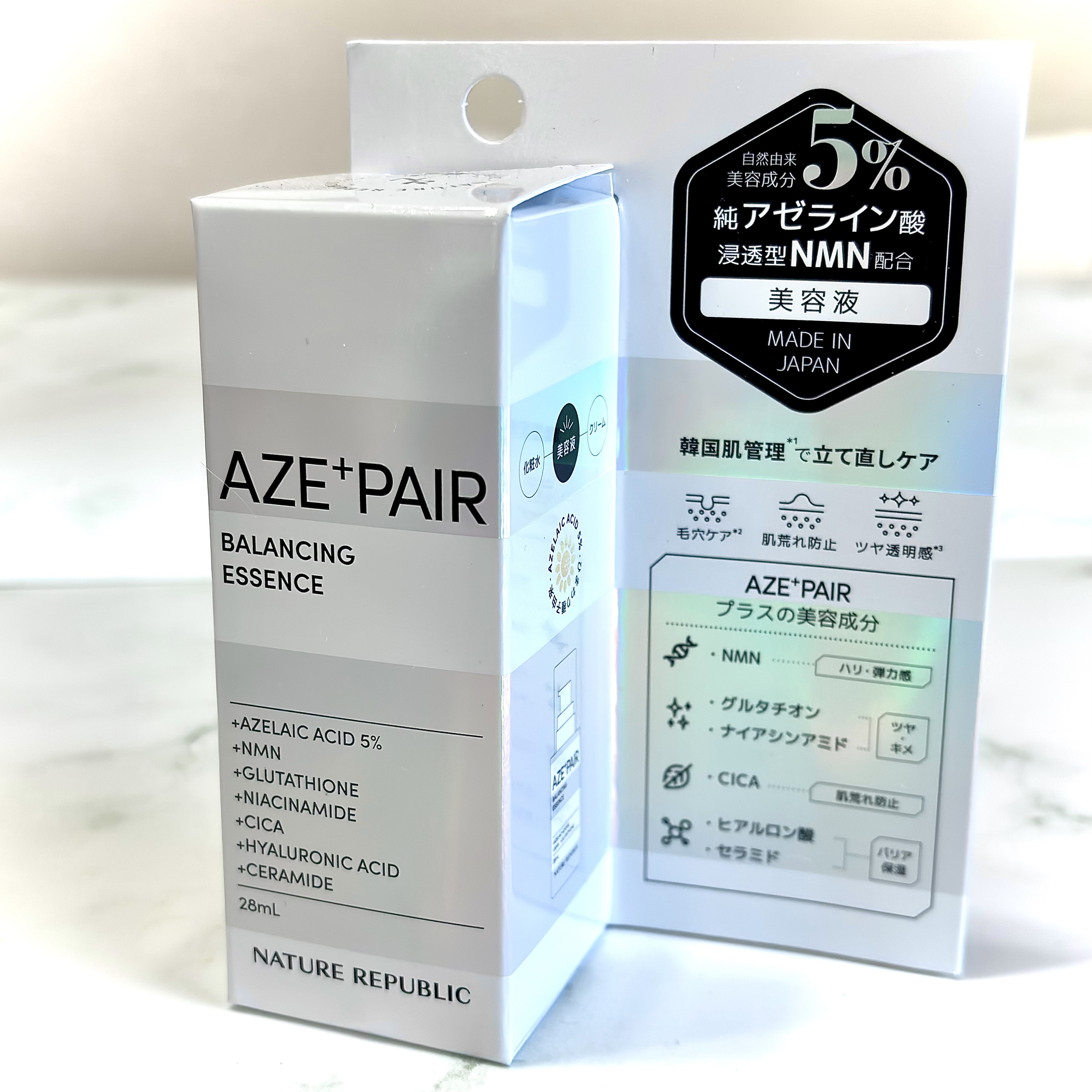 - 【韓国の肌管理*から発想を得たアゼペア】 高濃度*1の純アゼライン酸*2と厳選した美容成分が皮脂トラブル*3や肌荒れをしっかり防ぎながらも毛穴*4をケアして透明感*5のある肌へと整えます。 美容液には純アゼライン酸*2を5%配合しており、ミルクタイプのエッセンスが濃密なうるおいを素肌に届けます。普段のスキンケアにプラスするだけで皮脂トラブル*3をケアし、肌荒れを防ぎます。 先行発売:2024年8月31日よりロフト、PLAZA・MINiPLA、公式オンラインストアにて先行発売。 *うるおいケアのこと*1当社比*2保湿成分*3過剰な皮脂の分泌による肌荒れのこと*4乾燥によって開いた毛穴のこと*5うるおいを与えることによる肌印象のこと