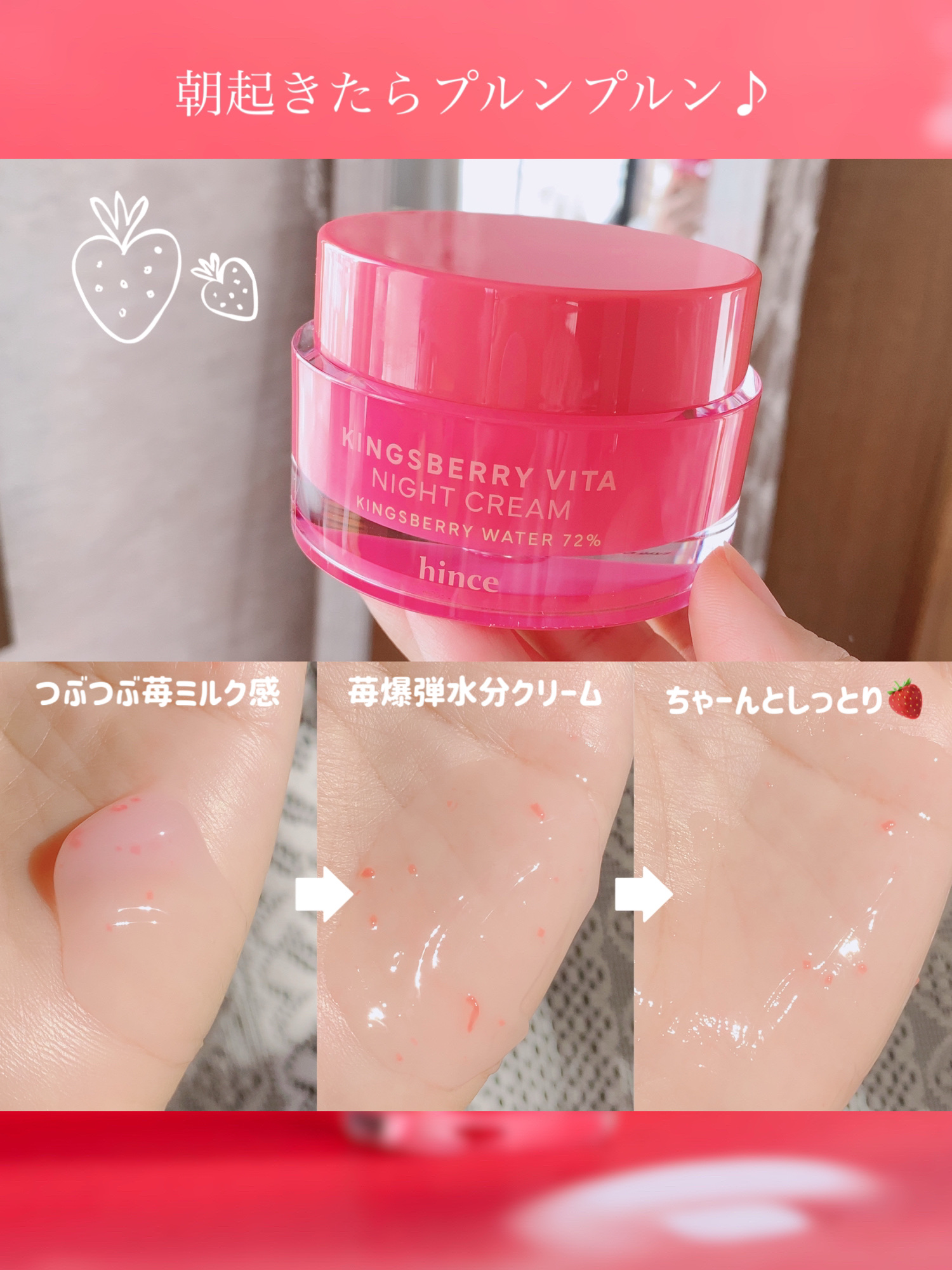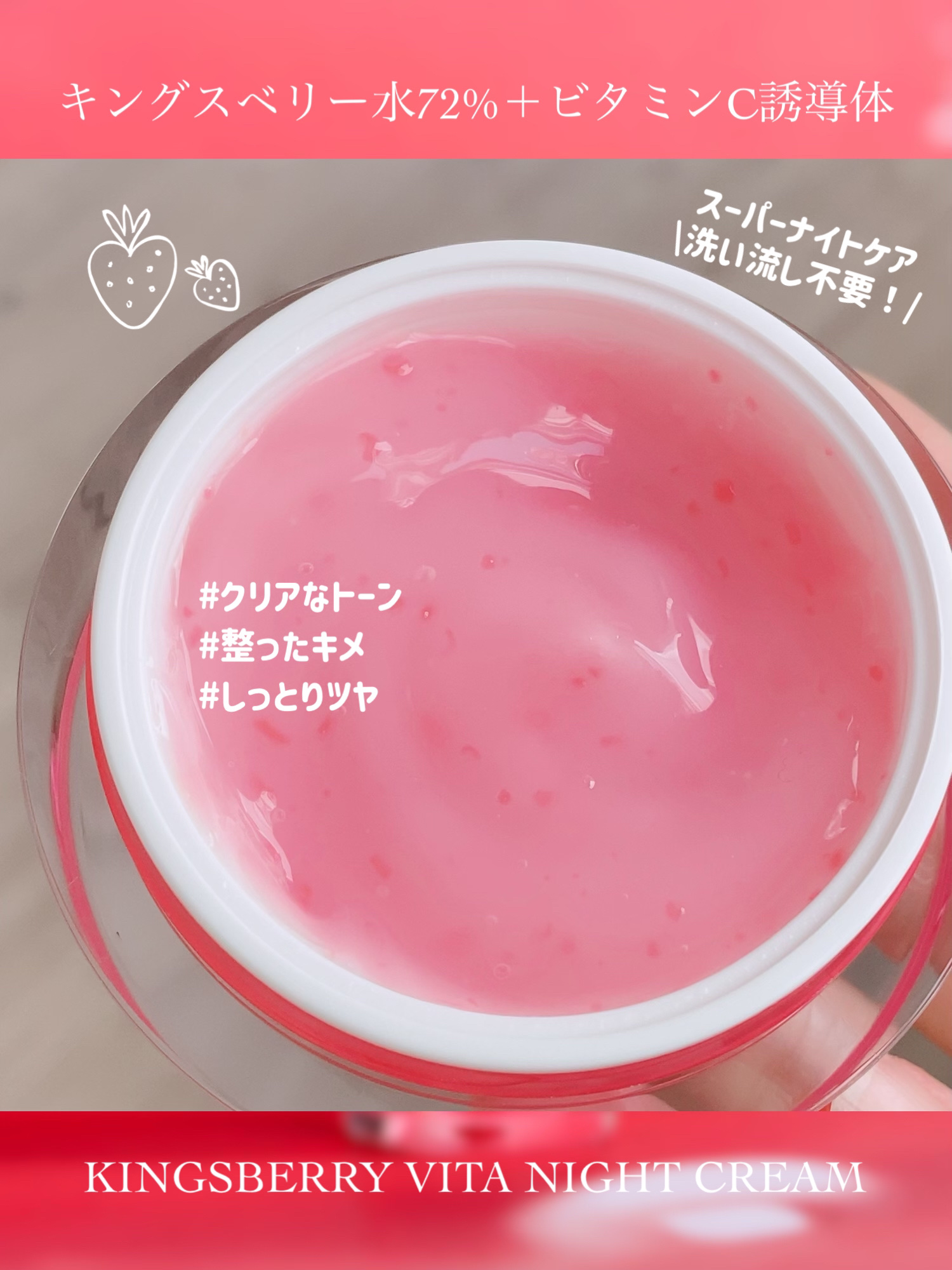 KINGSBERRY VITA NIGHT CREAM ↳ ビタミンC誘導体&パンテノールを配合したビタビーズ入りの肌馴染みいいジェルクリーム𓈒𓂂◌ 精製水の代わりにキングスベリー水が72%! 唇をしっとりぷるんとコーティング♥ スキンコンディショニングを95%以上配合でたっぷり保湿してくれるよ⋆* 開発に1年半かけたhinceのこだわりがいっぱい詰まってて なめらかでツヤ肌を目指す人たちに是非試して欲しい🥹💫