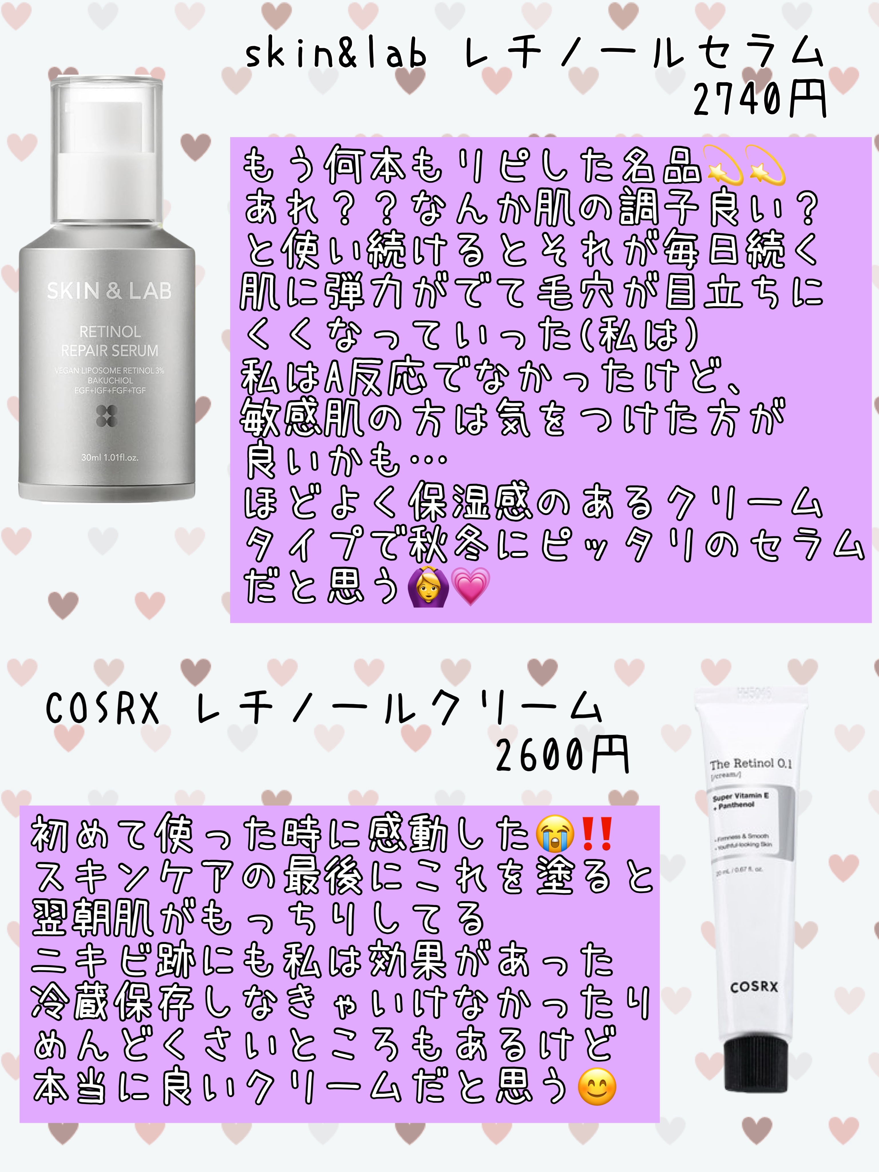 レチノールには肌のターンオーバーの促進シワ・ハリなどエイジング効果が期待できるときいていたのでずっと試してみてはいたかったのですが、、、 少しとろんとした黄色味がかった美容液 匂いは無臭で肌馴染みがよく、心配していたa反応も私は問題なし⚪︎ 正直、効果は感じられないだろうなーと思っていたのでこの結果には大満足🥹