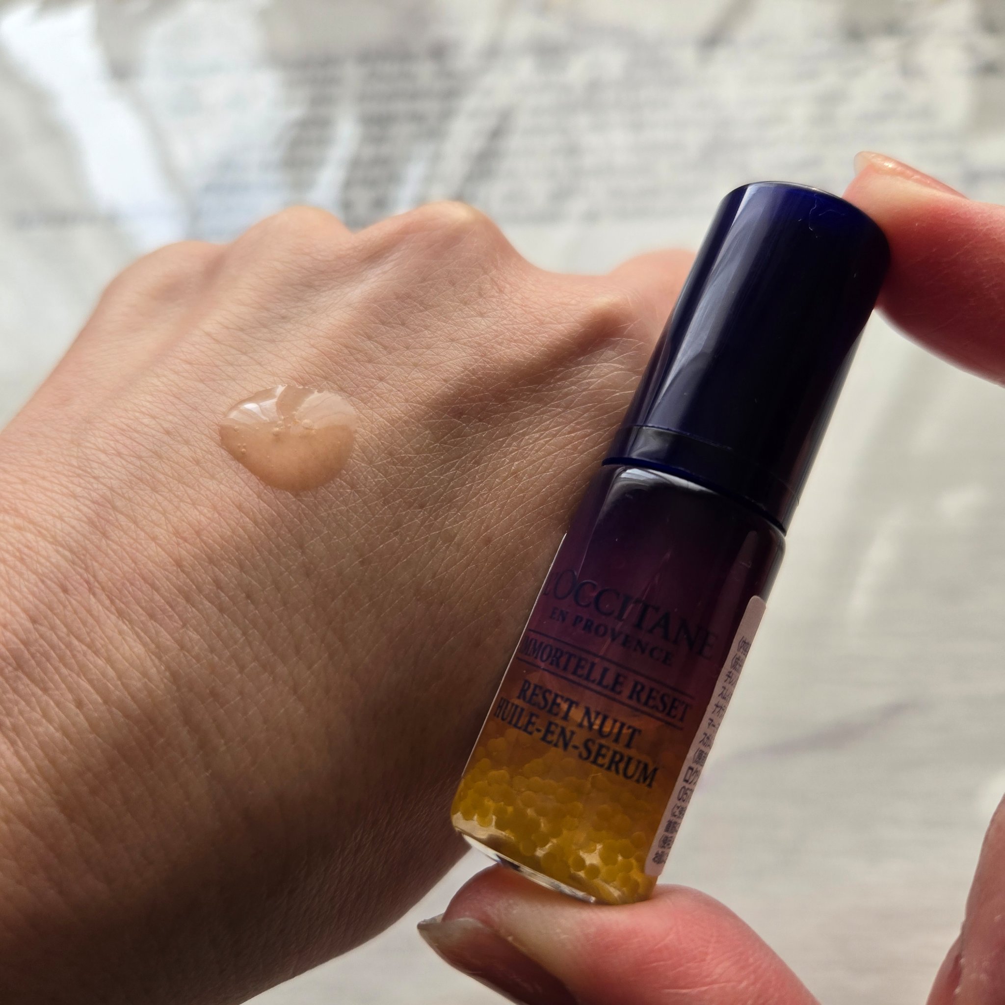 ロクシタンの人気美容液がリニューアル! ボトルの中で輝く黄金のオーガニックのイモーテルエッセンシャルオイルカプセル*使うたびにはじけて新鮮な美容成分を届けてくれるんです。 肌に触れた瞬間、ふわっと広がるイモーテルの香りに贅沢なナイトケアタイムを過ごしているように感じます。 この1本で簡単にプロ級のスキンケアができちゃいます!!