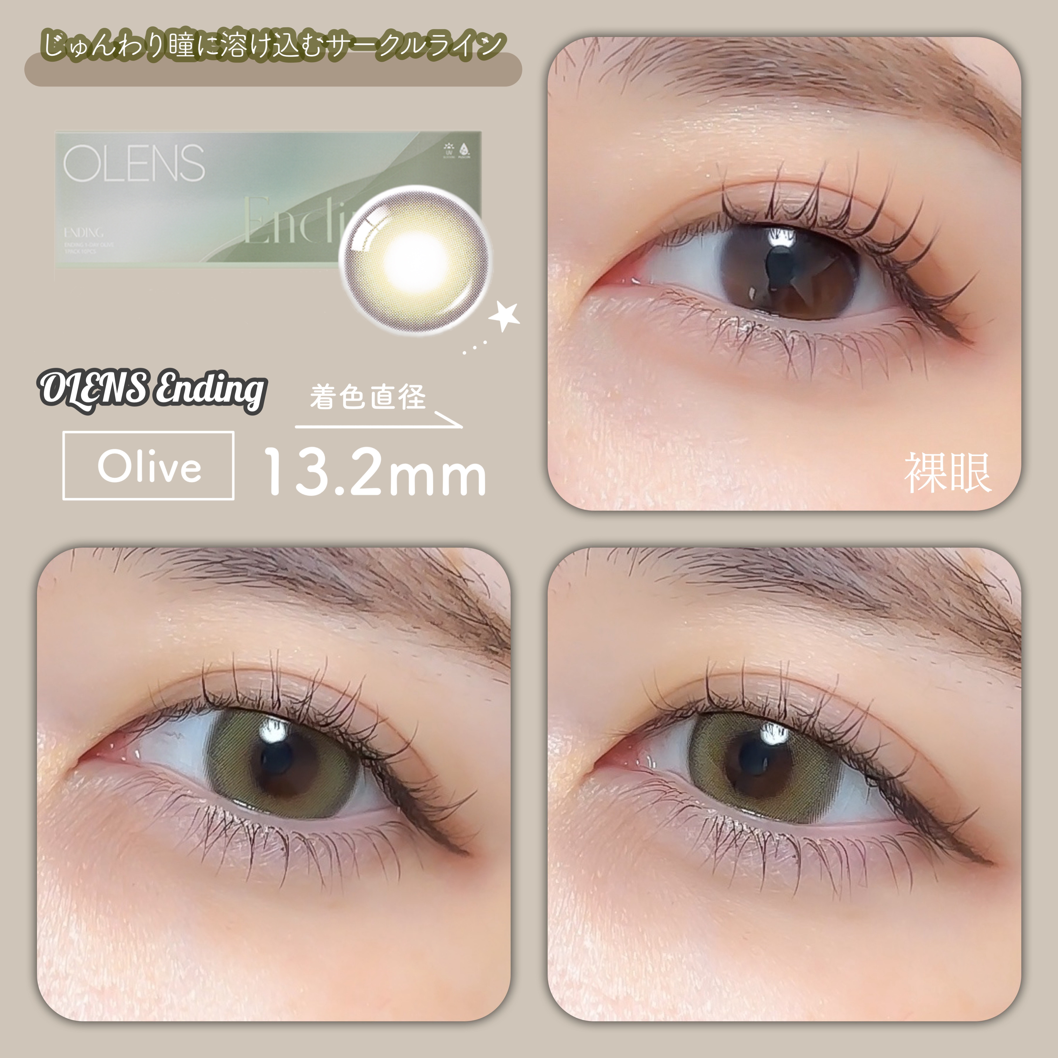 ナチュラル盛れからしっかり盛れまで様々! オリーブカラーが派手すぎずナチュラルすぎず絶妙なオリーブカラコン。 私のお気に入りはEnding 1day オリーブ。しっかりオリーブに発色するのに、かなりナチュラルで可愛いです💚 レンズ直径(DIA):14.2mm 着色直径:Ending 1dayオリーブ…13.2mm
