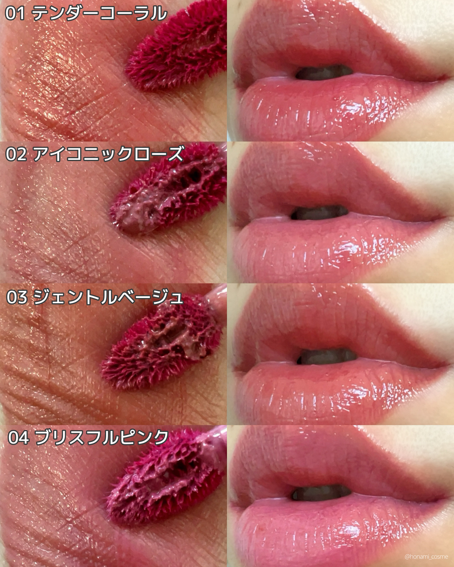 - <01 テンダーコーラル> 水、ダイマージリノール酸ダイマージリノレイルビス(ベヘニル/イソステアリル/フィトステリル)、ビスジグリセリルポリアシルアジペート-2、ジグリセリン、リンゴ酸ジイソステアリル、ジフェニルジメチコン、セチルPEG/PPG-10/1ジメチコン、ペンチレングリコール、トリメチルシロキシケイ酸、カプリリルメチコン、ポリソルベート60、セテアレス-20、ジメチコン、イソドデカン、グリセリン、(アクリル酸ヒドロキシエチル/アクリロイルジメチルタウリンNa)コポリマー、スクワラン、1,2-ヘキサンジオール、ポリアクリレート-13、ポリイソブテン、エチルヘキシルグリセリン、イソステアリン酸ソルビタン、トリイソステアリン酸ポリグリセリル-2、エチレンジアミンジコハク酸3Na、ポリソルベート20、水酸化Al、ポリアクリル酸アンモニウム、BG、アラントイン、ナイアシンアミド、トリ(カプリル酸/カプリン酸)グリセリル、水添レシチン、マカデミア種子油、アブラナステロールズ、ツボクサエキス、レチノール、コレステロール、ラウリン酸ポリグリセリル-10、セラミドNP、ラウロイルグルタミン酸ジ(オクチルドデシル/フィトステリル/ベヘニル)、ステアリン酸水酸化(Al/Mg)、セチルリン酸K、キトサン、クエン酸トリス(テトラメチルヒドロキシピペリジノール)、テトラ(ジ-t-ブチルヒドロキシヒドロケイヒ酸)ペンタエリスリチル、香料、フェノキシエタノール、酸化チタン、黄4、黄5、青1、赤227、赤104(1) <02 アイコニックローズ> 水、ダイマージリノール酸ダイマージリノレイルビス(ベヘニル/イソステアリル/フィトステリル)、ビスジグリセリルポリアシルアジペート-2、ジグリセリン、リンゴ酸ジイソステアリル、ジフェニルジメチコン、セチルPEG/PPG-10/1ジメチコン、ペンチレングリコール、トリメチルシロキシケイ酸、カプリリルメチコン、ポリソルベート60、セテアレス-20、ジメチコン、イソドデカン、グリセリン、(アクリル酸ヒドロキシエチル/アクリロイルジメチルタウリンNa)コポリマー、スクワラン、1,2-ヘキサンジオール、ポリアクリレート-13、ポリイソブテン、エチルヘキシルグリセリン、イソステアリン酸ソルビタン、エチレンジアミンジコハク酸3Na、ポリソルベート20、水酸化Al、ポリアクリル酸アンモニウム、BG、アラントイン、ナイアシンアミド、トリ(カプリル酸/カプリン酸)グリセリル、水添レシチン、マカデミア種子油、アブラナステロールズ、ツボクサエキス、レチノール、コレステロール、ラウリン酸ポリグリセリル-10、セラミドNP、ラウロイルグルタミン酸ジ(オクチルドデシル/フィトステリル/ベヘニル)、ステアリン酸水酸化(Al/Mg)、セチルリン酸K、キトサン、クエン酸トリス(テトラメチルヒドロキシピペリジノール)、テトラ(ジ-t-ブチルヒドロキシヒドロケイヒ酸)ペンタエリスリチル、香料、フェノキシエタノール、酸化チタン、黄4、黄5、青1、赤104(1)、赤227 <03 ジェントルベージュ> 水、ダイマージリノール酸ダイマージリノレイルビス(ベヘニル/イソステアリル/フィトステリル)、リンゴ酸ジイソステアリル、ビスジグリセリルポリアシルアジペート-2、ジグリセリン、ジフェニルジメチコン、セチルPEG/PPG-10/1ジメチコン、ペンチレングリコール、トリメチルシロキシケイ酸、カプリリルメチコン、ポリソルベート60、セテアレス-20、ジメチコン、イソドデカン、グリセリン、(アクリル酸ヒドロキシエチル/アクリロイルジメチルタウリンNa)コポリマー、スクワラン、1,2-ヘキサンジオール、ポリアクリレート-13、ポリイソブテン、エチルヘキシルグリセリン、イソステアリン酸ソルビタン、トリイソステアリン酸ポリグリセリル-2、エチレンジアミンジコハク酸3Na、ポリソルベート20、水酸化Al、ポリアクリル酸アンモニウム、BG、アラントイン、ナイアシンアミド、トリ(カプリル酸/カプリン酸)グリセリル、水添レシチン、マカデミア種子油、アブラナステロールズ、ツボクサエキス、レチノール、コレステロール、ラウリン酸ポリグリセリル-10、セラミドNP、ラウロイルグルタミン酸ジ(オクチルドデシル/フィトステリル/ベヘニル)、ステアリン酸水酸化(Al/Mg)、セチルリン酸K、キトサン、クエン酸トリス(テトラメチルヒドロキシピペリジノール)、テトラ(ジ-t-ブチルヒドロキシヒドロケイヒ酸)ペンタエリスリチル、香料、フェノキシエタノール、酸化チタン、酸化鉄、黄4、黄5、青1、赤104(1)、赤227 <04 ブリスフルピンク> 水、ダイマージリノール酸ダイマージリノレイルビス(ベヘニル/イソステアリル/フィトステリル)、ビスジグリセリルポリアシルアジペート-2、ジグリセリン、リンゴ酸ジイソステアリル、ジフェニルジメチコン、セチルPEG/PPG-10/1ジメチコン、ペンチレングリコール、トリメチルシロキシケイ酸、カプリリルメチコン、ポリソルベート60、セテアレス-20、ジメチコン、イソドデカン、グリセリン、(アクリル酸ヒドロキシエチル/アクリロイルジメチルタウリンNa)コポリ