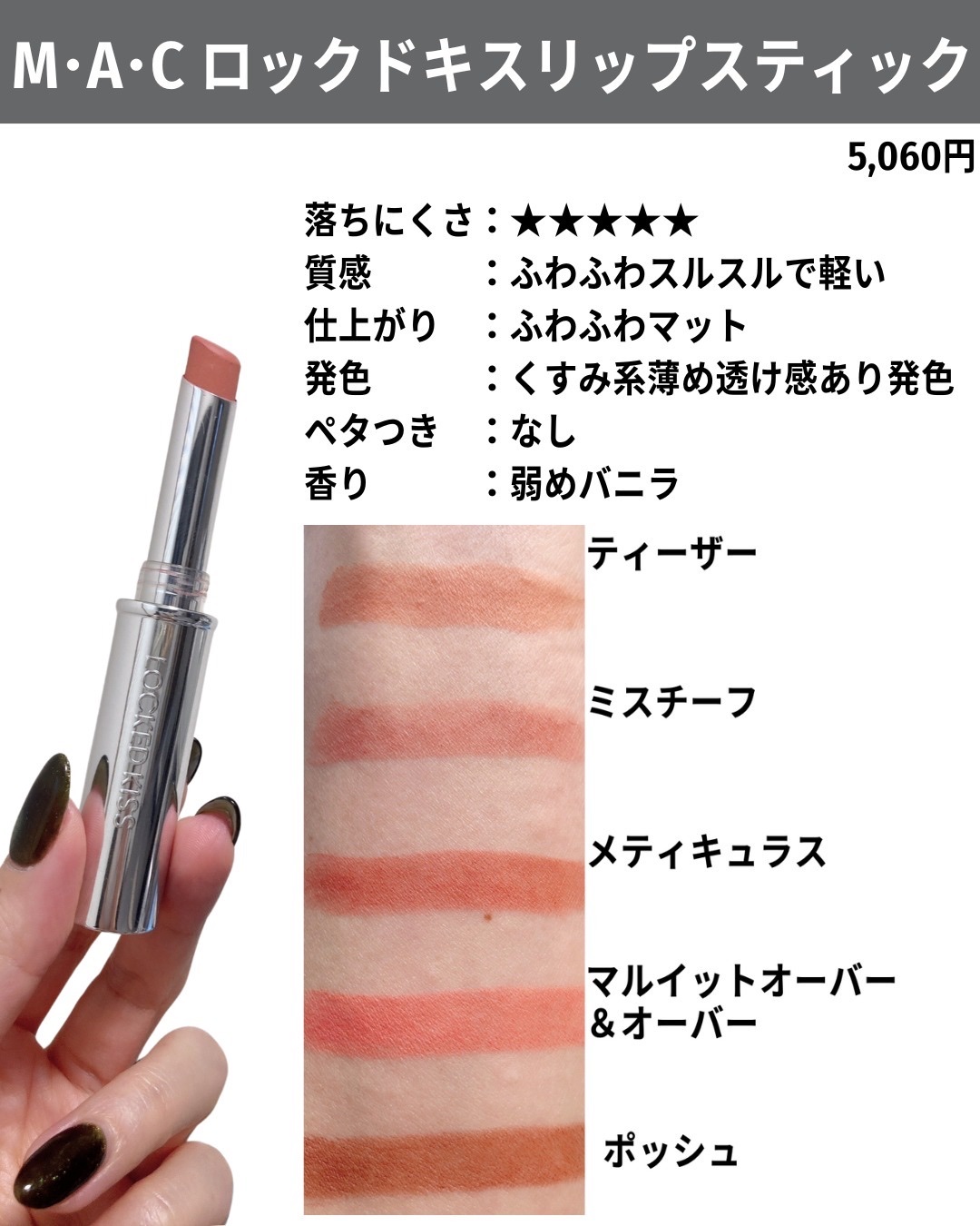 | 口紅・グロス・リップライナーランキング第91位 | 密着力が高くてよれづらいのでマスクをつけても マスクにリップは転写しづらく感じました! | 詳細を見る | |