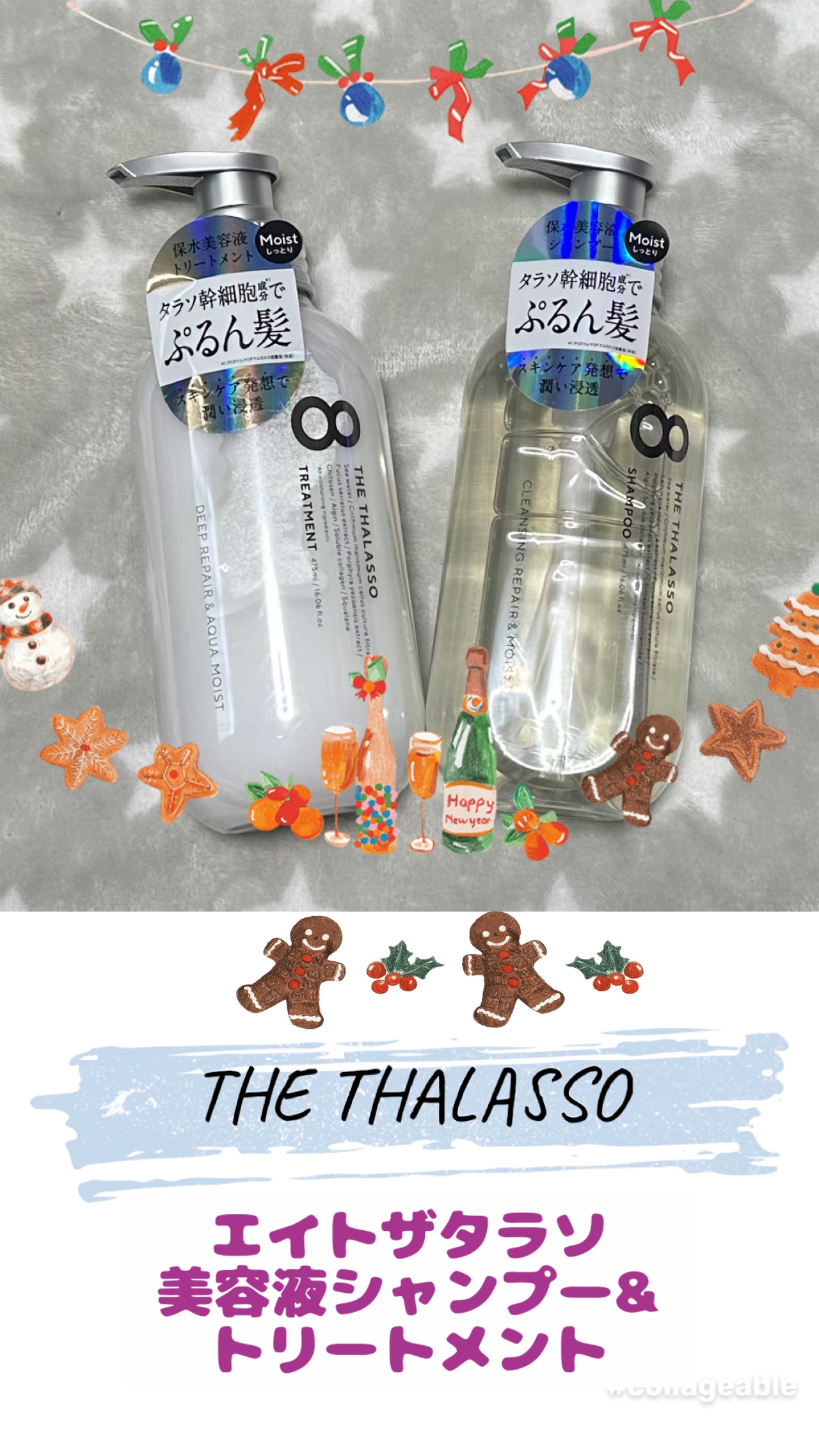 - <シャンプー> 水、ココイルメチルタウリンNa、ラウラミドプロピルベタイン、コカミドプロピルベタイン、グリセリン、コカミドメチルMEA、ラウロイルメチルアラニンNa、クリスマムマリチマムカルス培養液、リンゴ果実培養細胞エキス、ブドウ果実細胞エキス、マコンブエキス、スサビノリエキス、キトサンサクシナミド、フカスセラツスエキス、アルギン酸Na、海水、ラウロイルグルタミン酸ジ(フィトステリル/オクチルドデシル)、セラミドNG、セラミドAP、セラミドNP、水溶性コラーゲン、コレステロール(羊毛)、ウメ果実エキス、セイヨウハッカ葉エキス、ローズマリー葉エキス、ティーツリー葉油、ポリクオタニウム-10、ジステアリルジモニウムクロリド、クオタニウム-33、ラウラミドプロピルヒドロキシスルタイン、ジオレイン酸PEG-120メチルグルコース、クエン酸、ポリクオタニウム-47、アルギニン、ラウリルグルコシド、グリシン、フィチン酸、イソマルト、フィトステロールズ、PPG-7、BG、酸化銀、PG、水添レシチン、レシチン、EDTA-2Na、キサンタンガム、オレフィン(C14-16)スルホン酸Na、安息香酸Na、フェノキシエタノール、香料 <トリートメント> 水、セテアリルアルコール、ジメチコン、ベヘントリモニウムクロリド、グリセリン、パルミチン酸エチルヘキシル、クリスマムマリチマムカルス培養液、リンゴ果実培養細胞エキス、アルガニアスピノサカルス培養エキス、アルギン酸Na、フカスセラツスエキス、スサビノリエキス、水溶性コラーゲン、ラウロイルグルタミン酸ジ(フィトステリル/オクチルドデシル)、クオタニウム-33、ヒドロキシエチルウレア、加水分解ケラチン(羊毛)、セラミドNG、セラミドNP、セラミドAP、ポリクオタニウム-51、キトサンヒドロキシプロピルトリモニウムクロリド、ウメ果実エキス、セージ葉エキス、ローズマリー葉油、ラベンダー油、スクワラン、キトサン、イソマルト、水添レシチン、フィトステロールズ、キサンタンガム、レシチン、ジステアリルジモニウムクロリド、コレステロール、海水、シクロヘキサン-1,4-ジカルボン酸ビスエトキシジグリコール、ヒドロキシエチルセルロース、PG、クエン酸Na、クエン酸、BG、ペンテト酸5Na、安息香酸Na、フェノキシエタノール、香料 <シャンプー詰め替え> 水、ココイルメチルタウリンNa、ラウラミドプロピルベタイン、コカミドプロピルベタイン、グリセリン、コカミドメチルMEA、ラウロイルメチルアラニンNa、クリスマムマリチマムカルス培養液、リンゴ果実培養細胞エキス、ブドウ果実細胞エキス、マコンブエキス、スサビノリエキス、キトサンサクシナミド、フカスセラツスエキス、アルギン酸Na、海水、ラウロイルグルタミン酸ジ(フィトステリル/オクチルドデシル)、セラミドNG、セラミドAP、セラミドNP、水溶性コラーゲン、コレステロール(羊毛)、ウメ果実エキス、セイヨウハッカ葉エキス、ローズマリー葉エキス、ティーツリー葉油、ポリクオタニウム-10、ジステアリルジモニウムクロリド、クオタニウム-33、ラウラミドプロピルヒドロキシスルタイン、ジオレイン酸PEG-120メチルグルコース、クエン酸、ポリクオタニウム-47、アルギニン、ラウリルグルコシド、グリシン、フィチン酸、イソマルト、フィトステロールズ、PPG-7、BG、酸化銀、PG、水添レシチン、レシチン、EDTA-2Na、キサンタンガム、オレフィン(C14-16)スルホン酸Na、安息香酸Na、フェノキシエタノール、香料 <トリートメント詰め替え> 水、セテアリルアルコール、ジメチコン、ベヘントリモニウムクロリド、グリセリン、パルミチン酸エチルヘキシル、クリスマムマリチマムカルス培養液、リンゴ果実培養細胞エキス、アルガニアスピノサカルス培養エキス、アルギン酸Na、フカスセラツスエキス、スサビノリエキス、水溶性コラーゲン、ラウロイルグルタミン酸ジ(フィトステリル/オクチルドデシル)、クオタニウム-33、ヒドロキシエチルウレア、加水分解ケラチン(羊毛)、セラミドNG、セラミドNP、セラミドAP、ポリクオタニウム-51、キトサンヒドロキシプロピルトリモニウムクロリド、ウメ果実エキス、セージ葉エキス、ローズマリー葉油、ラベンダー油、スクワラン、キトサン、イソマルト、水添レシチン、フィトステロールズ、キサンタンガム、レシチン、ジステアリルジモニウムクロリド、コレステロール、海水、シクロヘキサン-1,4-ジカルボン酸ビスエトキシジグリコール、ヒドロキシエチルセルロース、PG、クエン酸Na、クエン酸、BG、ペンテト酸5Na、安息香酸Na、フェノキシエタノール、香料 <エイトザタラソ クレンジングリペア&モイスト 美容液シャンプー ハローキティ A 詰め替え> 水、ココイルメチルタウリンNa、ラウラミドプロピルベタイン、コカミドプロピルベタイン、グリセリン、コカミドメチルMEA、ラウロイルメチルアラニンNa、クリスマムマリチマムカルス培養液、リンゴ果実培養細胞エキス、ブドウ果実細胞エキス、マコンブエキス、スサビノリエ