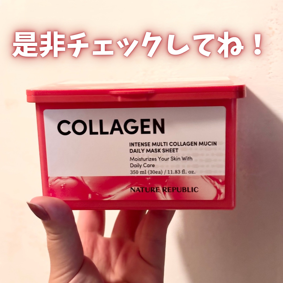 うるぷるな肌になりたい! 毎日手軽にケアしよ🎶 ネイチャーリパブリック インテンスマルチコラーゲンムチンデイリーマスク 薄くてやわらかいシートがしっかり肌に密着✨ はがした後は肌がひんやりしっとり💎