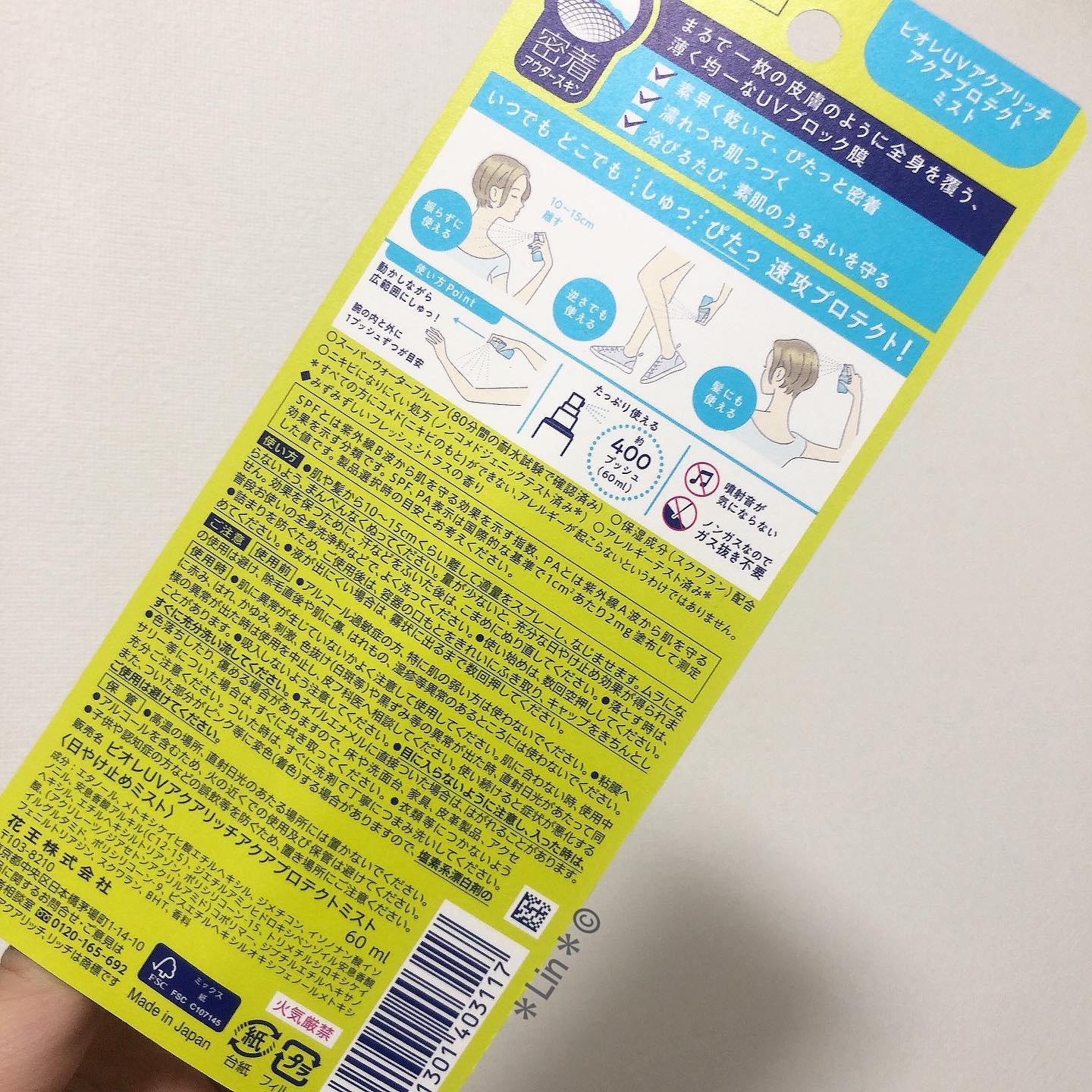 - 「しゅっ」→「ぴたっ」浴びる霧!?からのムラなく密着!いつでもどこでも速攻プロテクトで濡れつや肌続く!瞬感ミストUV。SPF50 PA++++、スーパーウォータープルーフ(80分間の耐水試験で確認済み)。顔・からだ用日やけ止め(髪にも使える)。素早くなじんで、白浮きしない。浴びるたび素肌のうるおい守る。スクワラン配合(保湿成分)。せっけんで落とせる。