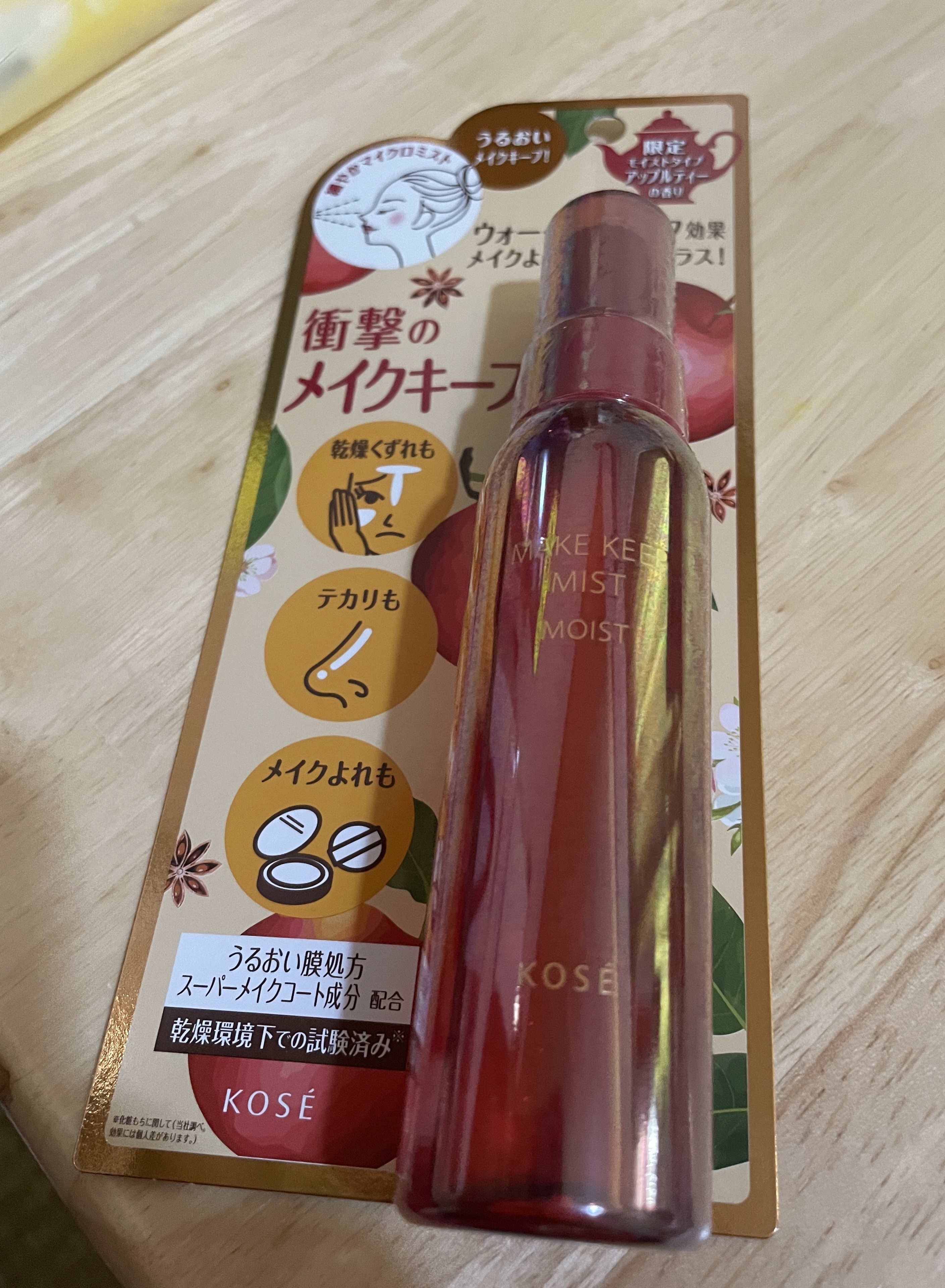 限定商品です。2層式なのでメイク後に10回以上振ってから、15センチくらい離して、顔全体に5〜6プッシュスプレーします。 モイストタイプなので、通常のメイクキープミストよりしっとりするように感じました。 香りは、スパイスの隠し味が効いた、心いやされるアップルティーの香り。