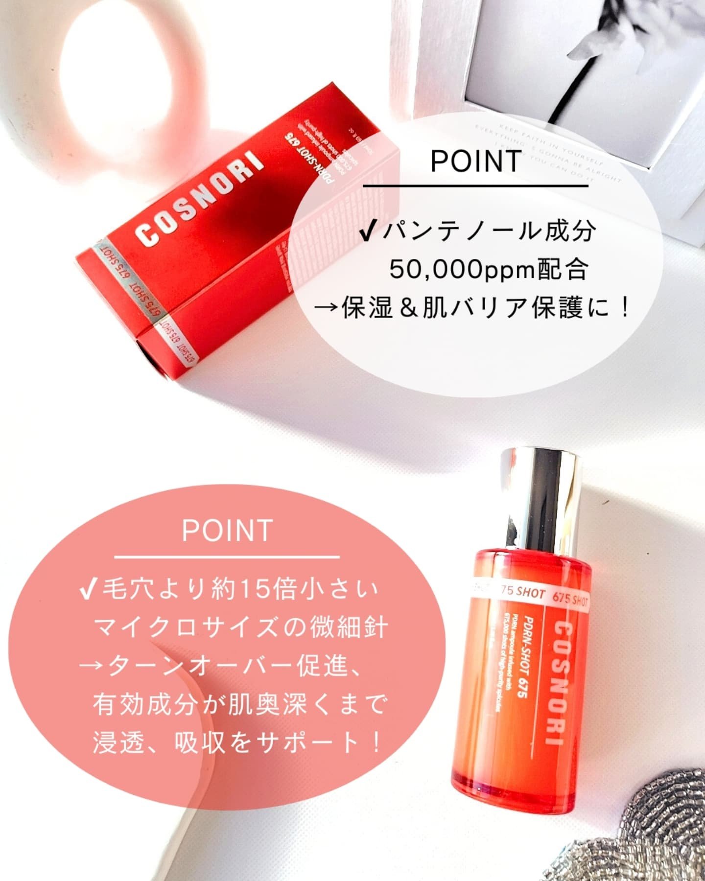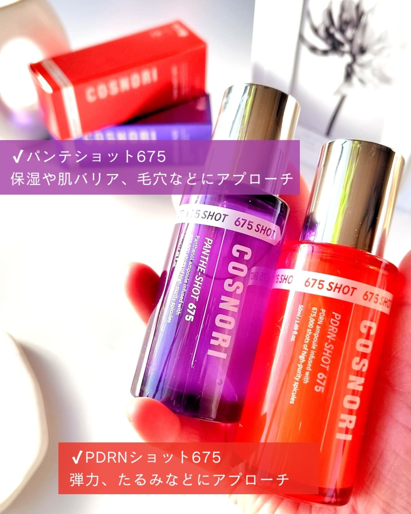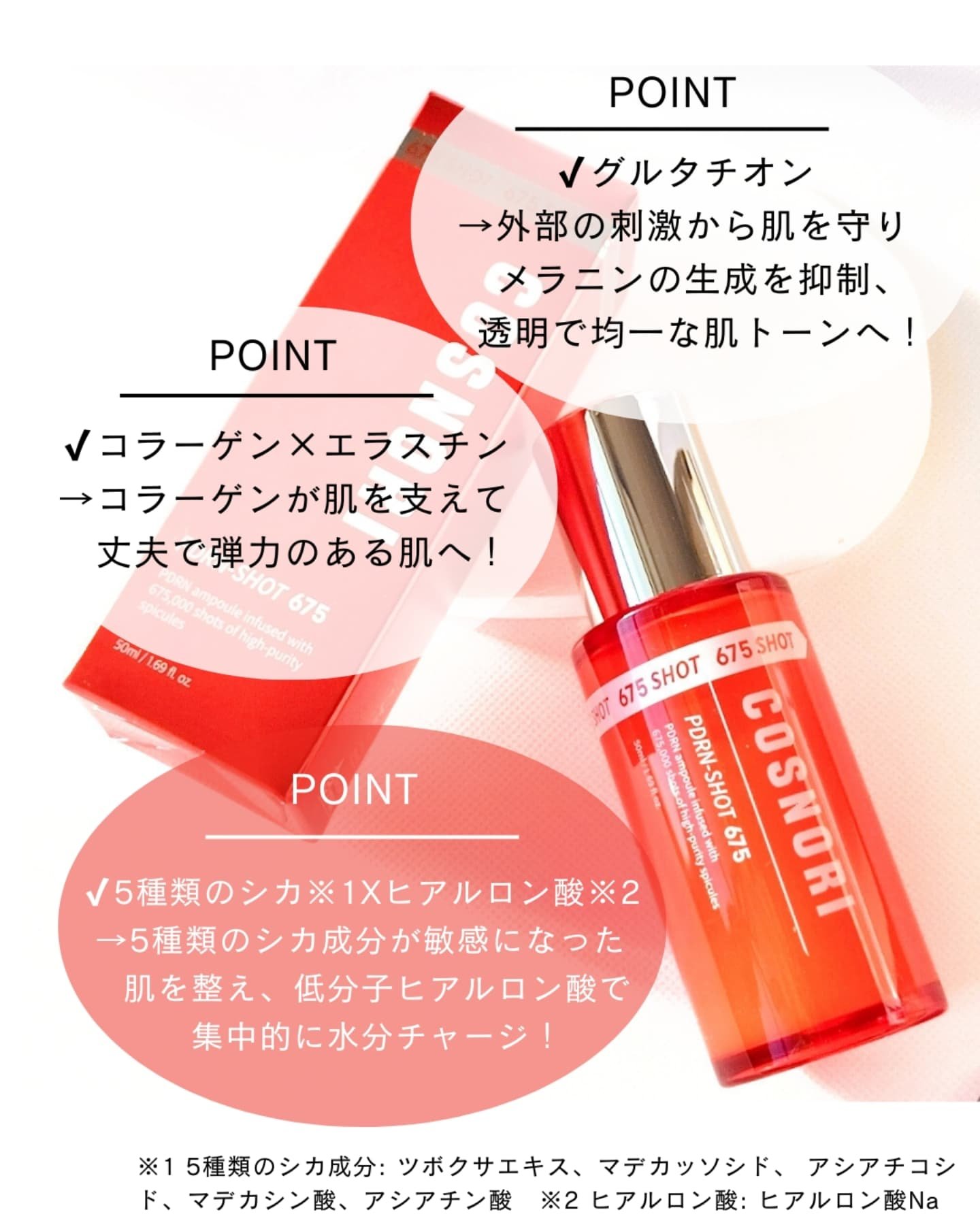 肌の組織と最も類似している成分サーモンPDRN 5,000ppm配合しており弾力ケアができるだけでなく、保湿&肌バリア保護に優れたパンテノール成分50,000ppmが配合。 保湿&肌バリア保護に優れたパンテノール100,000ppm配合。さらにナイアシンアミド・アデノシン配合で美白&弾力ケアまで同時に。 PDRNショット675はとろみがあるもののなじみが良くモチッとうるおい感のある肌に。