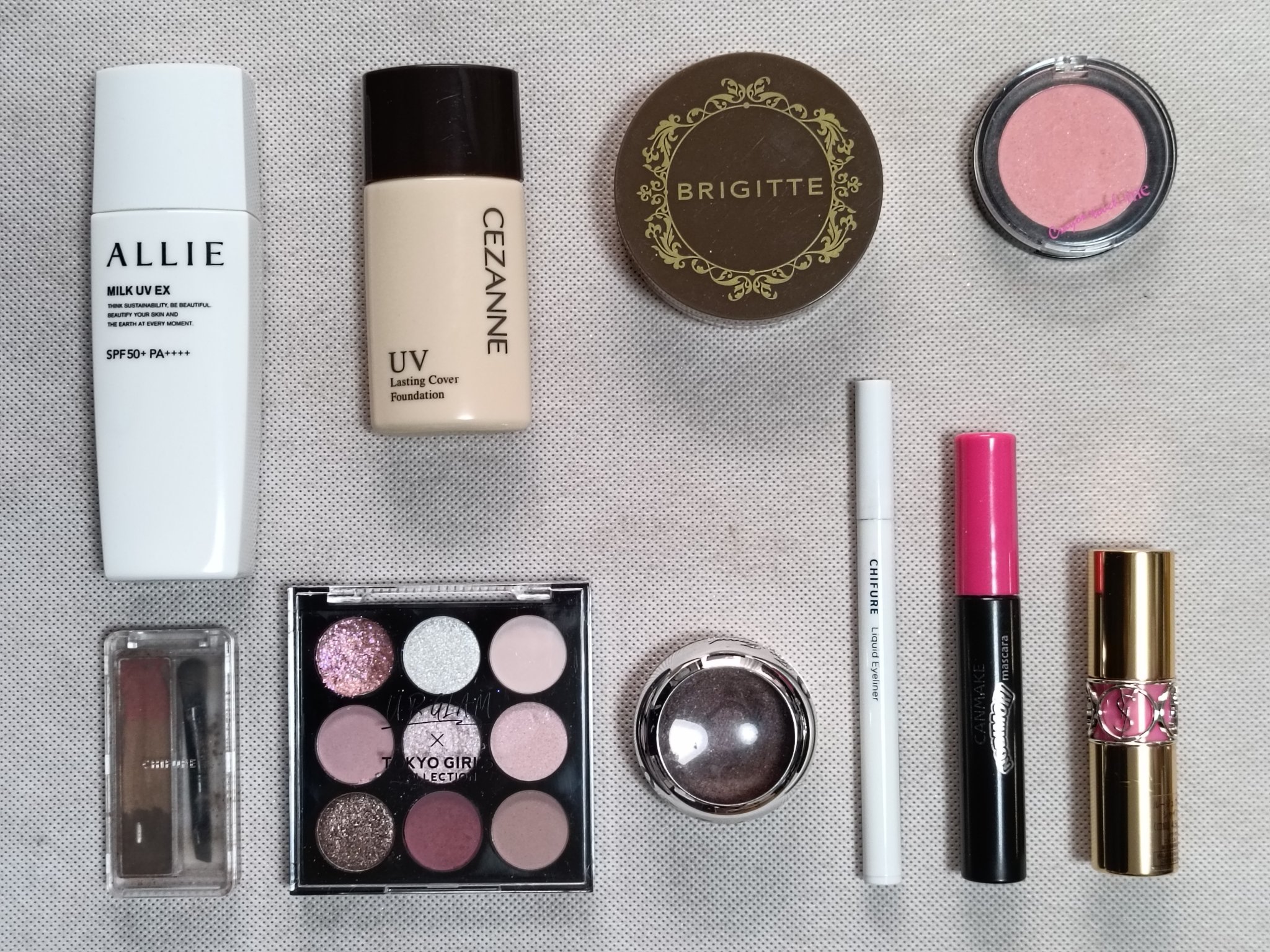 アリィー ニュアンスチェンジUV ジェル RSを、顔全体にまんべんなく塗ります。 RMK RMK ジェルクリーミィファンデーション 103を、顔全体にまんべんなく塗ります。 ジョンソンベビー ジョンソン ベビーパウダーを、顔全体にまんべんなく軽くはたきます。 THE BODY SHOP bronze shade warm glowを、両頬に塗ります。 KATE リフレクトミラーアイズ BR-1の締め色を、眉毛全体にまんべんなく塗ります。 URGLAM UR GLAMBLOOMING EYE COLOR PALETTE 01を、使用しました。 ちふれ リキッド アイライナー 筆ペンタイプ BK30 ブラックを、塗ります。 CEZANNE エアリーカールマスカラを、まつ毛全体にまんべんなく塗ります。 MAYBELLINE NEW YORK コロッサルボリュームエクスプレスを、まつ毛全体にまんべんなく塗ります。 MAYBELLINE NEW YORK SPステイ マットインク 135を、唇全体にまんべんなく塗ります。
