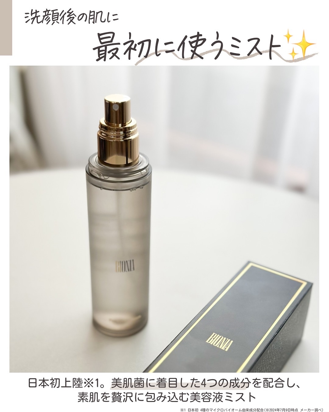 - ●スキンケアのファーストステップからゆるぎない肌を 洗顔後の無防備な肌にミストがすーっと浸透(※2)し、うるおいでバリア機能を整え、肌を守ります。 ●こだわり抜いた美容成分 3種のマイクロバイオーム由来成分(※3)をBIONIAのファンデーションの100倍の配合率に。さらに、みずみずしい透明感を与えるマイクロバイオーム由来成分(※4)を1種類追加で配合しました。また、IKKOさんとこだわり抜いた美容成分をたっぷりと配合しています。うるおいを与えて洗顔後の肌環境を整えます。 1.4種のマイクロバイオーム由来成分(※3) 2.肌を整える「乳酸桿菌エキス(※5)」 3.多角的に働きかけるコラーゲン(※6) 4.乾燥ダメージを受けた肌を保湿し肌荒れを防ぐTECA(※7)・CICA(※8) ●霧に包まれるような微粒子ミスト 洗顔後の無防備な肌に使用することを考え、ミストのきめ細かさにもこだわりました。霧に包まれるような感覚で、ふんわりと心地良いミストが広がり、ラベンダーの香りに包まれます。 ※2角質層まで ※3ストレプトコッカスサーモフィルス培養物、ミクロコッカス溶解液、スタフィロコッカスエピデルミジス培養液(全て保湿成分) ※4ミクロコッカス溶解液(保湿成分) ※5乳酸桿菌、ポリムニアソンチホリア根汁、α-グルカンオリゴサッカリド(全て皮膚コンディショニング成分) ※6保湿成分 ※7アシアチコシド、マデカシン酸、アシアチン酸(全て皮膚コンディショニング成分) ※8ツボクサエキス(皮膚コンディショニング成分)