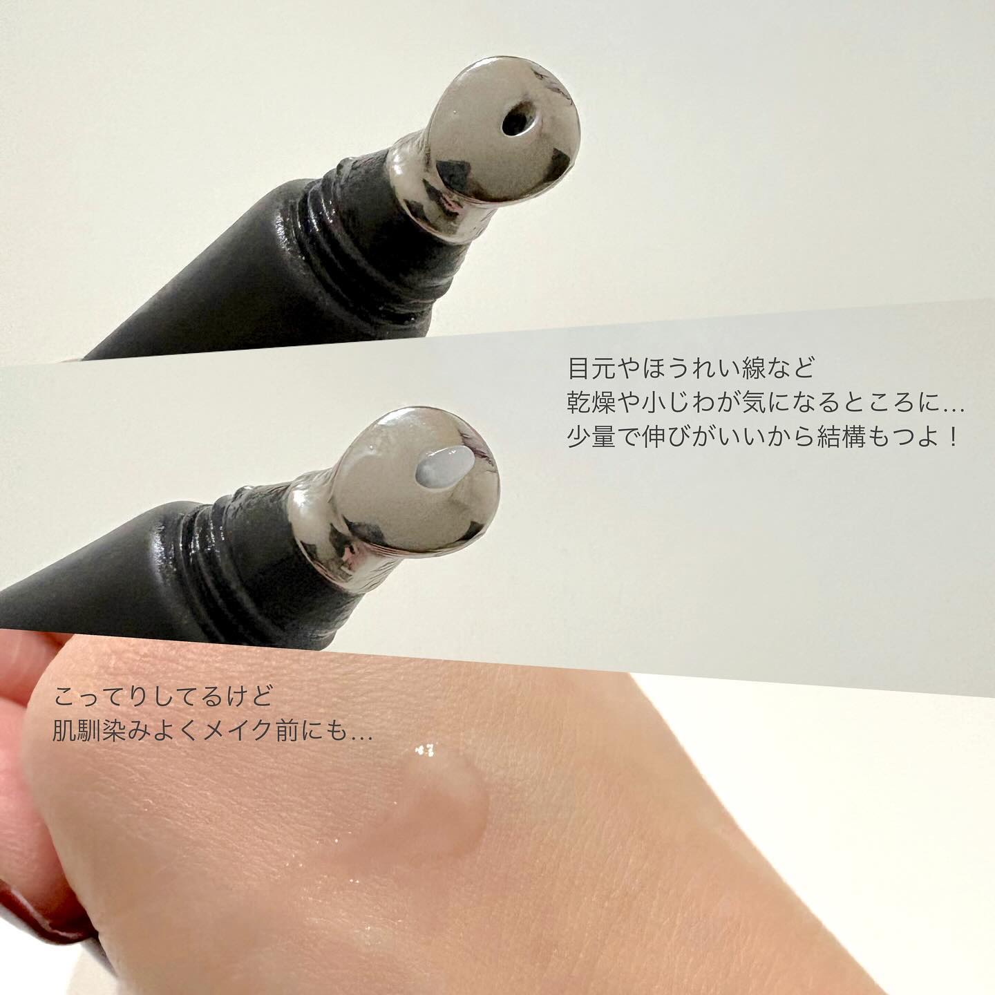 ☆Nオーガニックリンクルパックエッセンス肌のの水分を保ち目元をなめらかにする集中ケア美容液チューブタイプでアプリケーター付きなので手を汚さずサッと塗れる。アプリケーターがひんやりして気持ちいい。美容液は伸びがとても良くワンプッシュで左右の目元...
