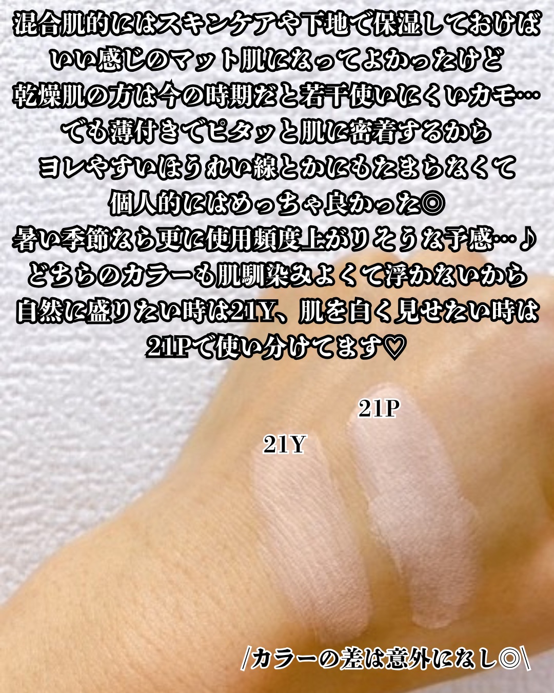 | ファンデーションランキング第21位 | セミマットな仕上がりです。細かいパウダーが施されているようで、軽くお肌に乗りました! | 詳細を見る | |