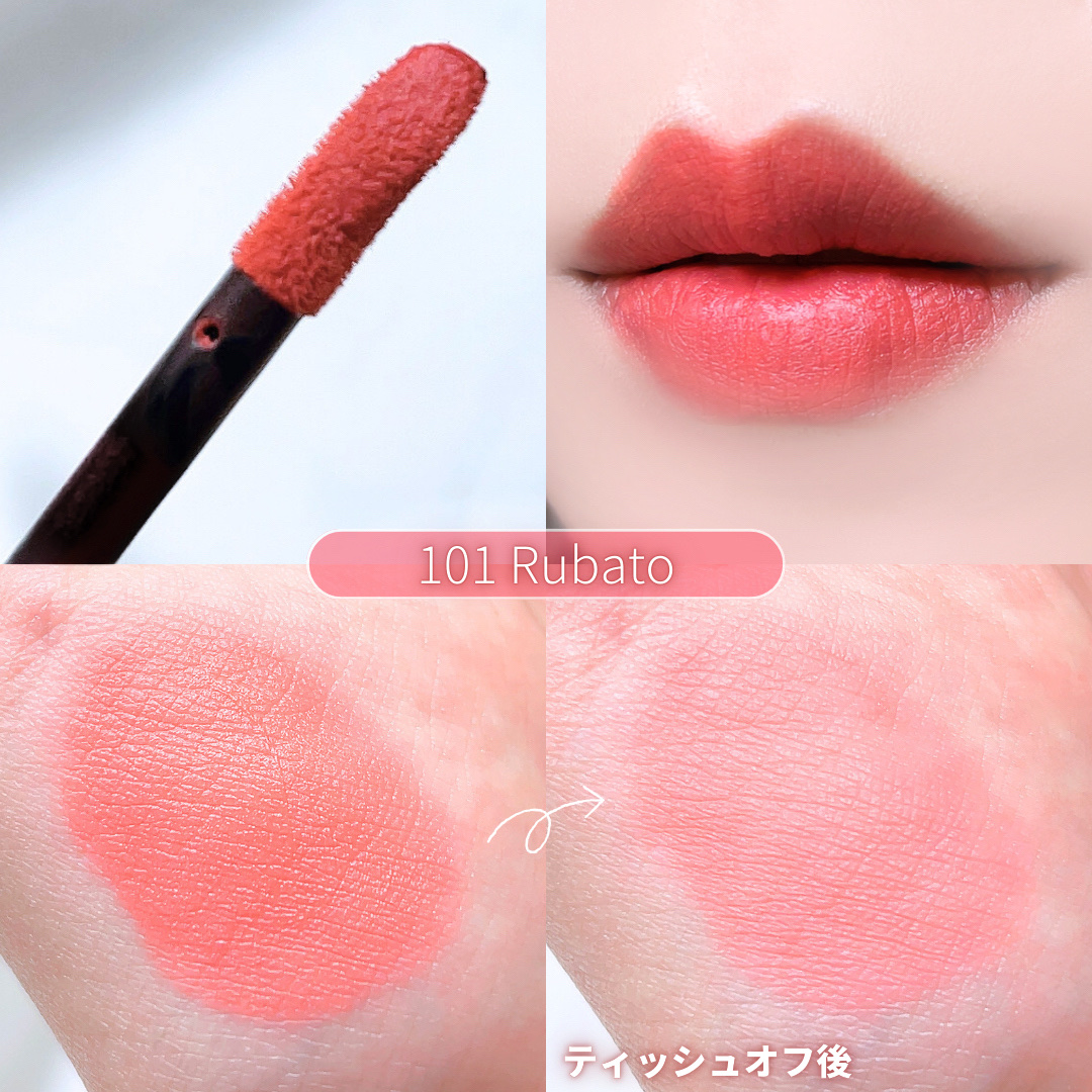 ”マダムバタフライ”の小説とオペラにインスパイアを受けたコレクション♡ 東洋画の清楚な桃の木のように、中彩度の雰囲気が美しいリップ。 ふんわりソフトマット&しっとり密着するテクスチャーでブラーフィルターがかかったような印象に仕上げてくれたよ✨️ 私が使ったカラーはこちら♡ ✓101 Rubato (ルバート) →やわらかなピンクレッド ✓102 Legato (レガート)→落ち着いたディープローズ