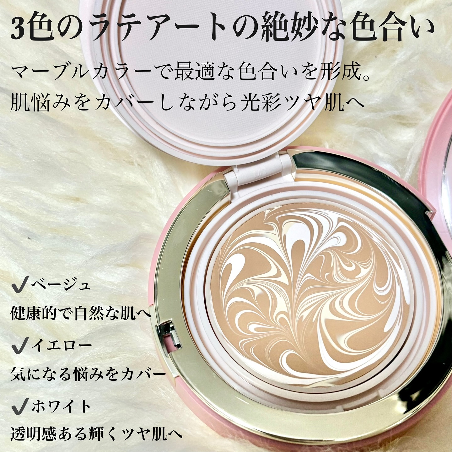 - ●美容保湿成分90.7%ビタミンC誘導体配合* 美容液を配合したなめらかなつけ心地 ●3色のラテアートの絶妙な色合い こだわりの色合いで、悩みをカバーしながら光彩ツヤ肌を演出 *3ーOーエチルアスコルビン酸(製品の抗酸化剤 )