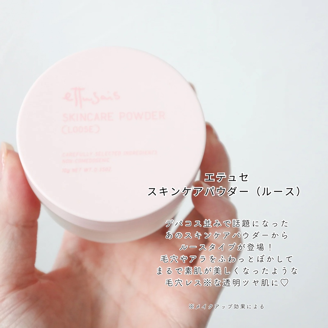 デパコス並みの粉質が話題のエテュセ スキンケアパウダーからルースタイプ登場🙌 肌の上で消えるようになじむ粉質で毛穴やアラをふんわりとぼかし、まるで素肌が美しくなったような透明ツヤ肌に💠 サラサラなのに乾燥が気になりにくいのも嬉しいポイントです💡