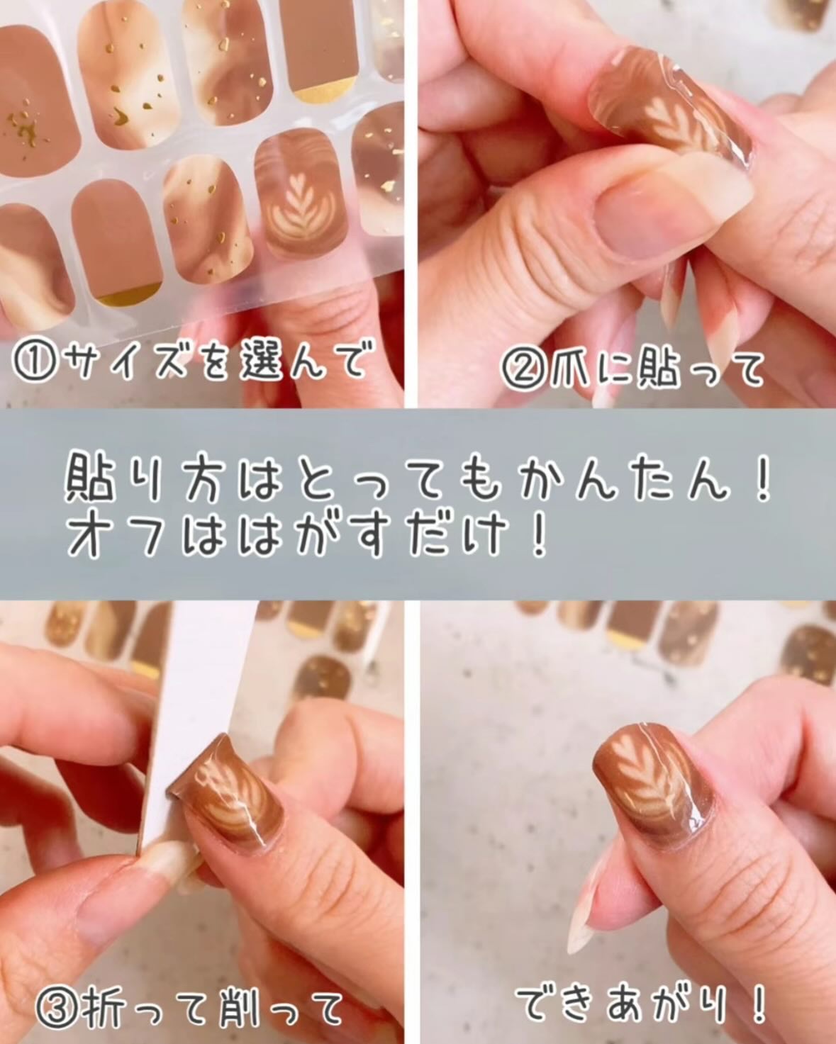 子どもの手でもこんなに大人っぽくステキに仕上がります! 本来は大人用なので、短い爪や丸い爪、小さな爪の方にもおすすめです😊 秋にピッタリなデザインもたくさんありました🍂 ネイルのもちは1日程度とおもっておいたほうがよさそう!特に表面の透明な層がよく剥がれるのだとか💦