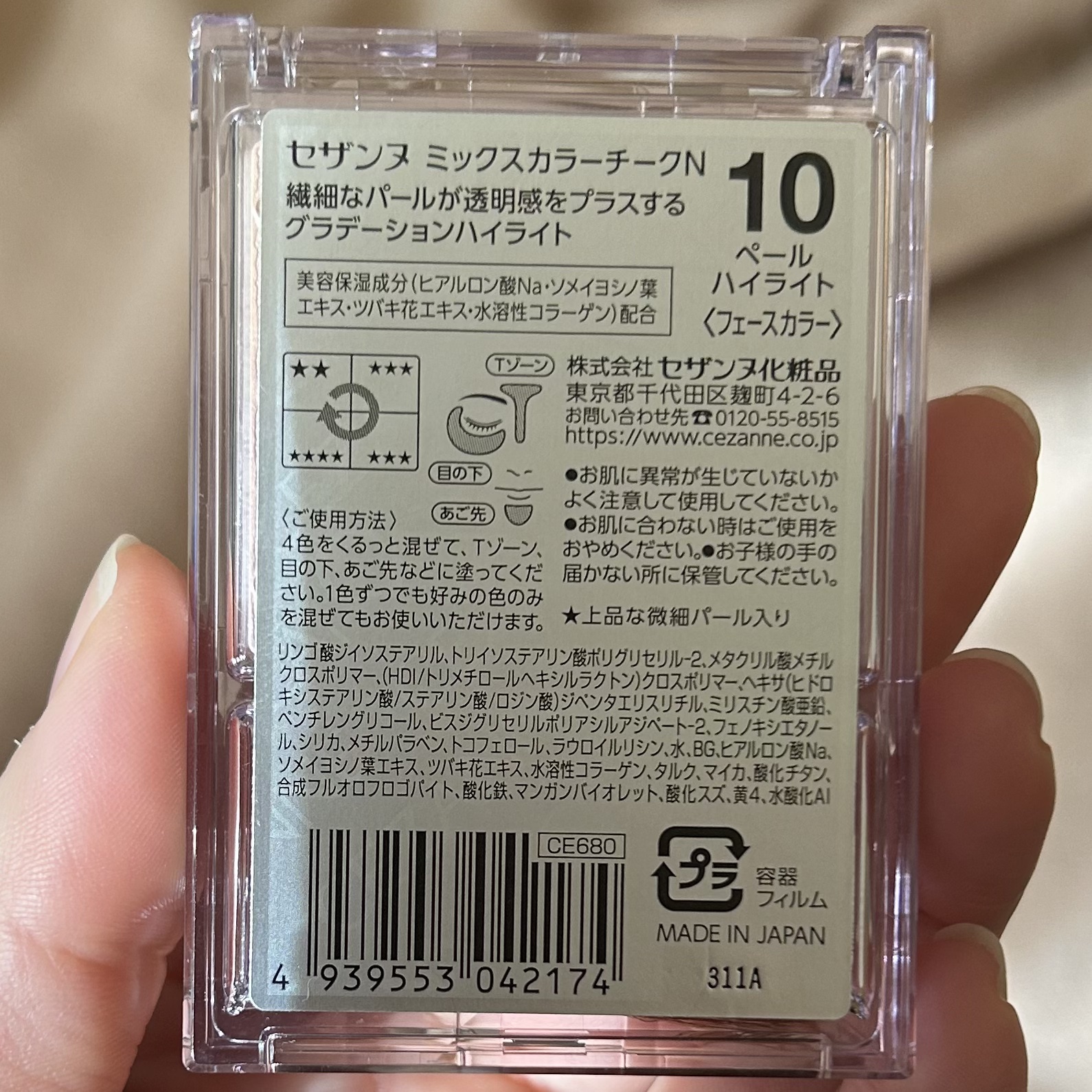- <10ペールハイライト> リンゴ酸ジイソステアリル、トリイソステアリン酸ポリグリセリル-2、メタクリル酸メチルクロスポリマー、(HDI/トリメチロールヘキシルラクトン)クロスポリマー、ヘキサ(ヒドロキシステアリン酸/ステアリン酸/ロジン酸)ジペンタエリスリチル、ミリスチン酸亜鉛、ペンチレングリコール、ビスジグリセリルポリアシルアジペート-2、フェノキシエタノール、シリカ、メチルパラベン、トコフェロール、ラウロイルリシン、水、BG、ヒアルロン酸Na、ソメイヨシノ葉エキス、ツバキ花エキス、水溶性コラーゲン、タルク、マイカ、酸化チタン、合成フルオロフロゴパイト、酸化鉄、マンガンバイオレット、酸化スズ、黄4、水酸化Al <01ウォームローズ> リンゴ酸ジイソステアリル、トリイソステアリン酸ポリグリセリル-2、メタクリル酸メチルクロスポリマー、(HDI/トリメチロールヘキシルラクトン)クロスポリマー、ミリスチン酸亜鉛、ジメチコン、ペンチレングリコール、ビスジグリセリルポリアシルアジペート-2、フェノキシエタノール、シリカ、メチルパラベン、トコフェロール、水、BG、ヒアルロン酸Na、ソメイヨシノ葉エキス、ツバキ花エキス、水溶性コラーゲン、マイカ、タルク、合成フルオロフロゴパイト、酸化チタン、ラウロイルリシン、酸化鉄、グンジョウ、マンガンバイオレット、黄4、赤202、赤226、水酸化Al、酸化スズ <02ピュアコーラル> リンゴ酸ジイソステアリル、トリイソステアリン酸ポリグリセリル-2、メタクリル酸メチルクロスポリマー、(HDI/トリメチロールヘキシルラクトン)クロスポリマー、ミリスチン酸亜鉛、ジメチコン、ペンチレングリコール、ビスジグリセリルポリアシルアジペート-2、フェノキシエタノール、シリカ、メチルパラベン、トコフェロール、水、BG、ヒアルロン酸Na、ソメイヨシノ葉エキス、ツバキ花エキス、水溶性コラーゲン、マイカ、タルク、合成フルオロフロゴパイト、酸化チタン、ラウロイルリシン、酸化鉄、赤226、黄4、赤202、酸化スズ、グンジョウ、水酸化Al