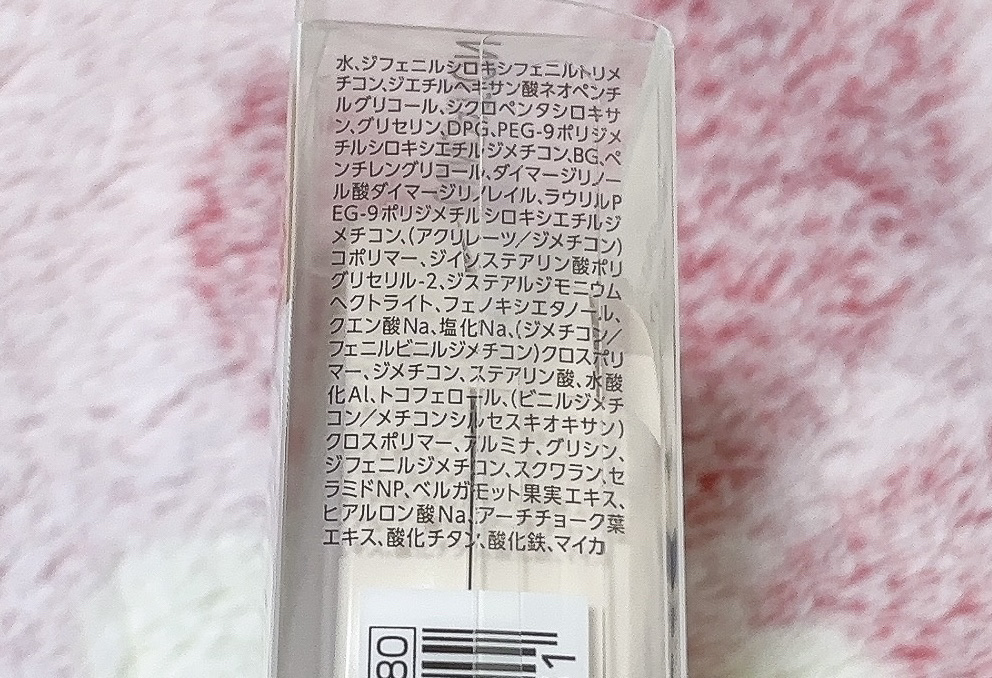 - <00 明るいベージュ系> 水、ジフェニルシロキシフェニルトリメチコン、ジエチルヘキサン酸ネオペンチルグリコール、シクロペンタシロキサン、グリセリン、DPG、PEG-9ポリジメチルシロキシエチルジメチコン、BG、ペンチレングリコール、ダイマージリノール酸ダイマージリノレイル、ラウリルPEG-9ポリジメチルシロキシエチルジメチコン、(アクリレーツ/ジメチコン)コポリマー、ジイソステアリン酸ポリグリセリル-2、ジステアルジモニウムヘクトライト、フェノキシエタノール、クエン酸Na、塩化Na、(ジメチコン/フェニルビニルジメチコン)クロスポリマー、ジメチコン、ステアリン酸、水酸化Al、トコフェロール、(ビニルジメチコン/メチコンシルセスキオキサン)クロスポリマー、アルミナ、グリシン、ジフェニルジメチコン、スクワラン、セラミドNP、ベルガモット果実エキス、ヒアルロン酸Na、アーチチョーク葉エキス、酸化チタン、酸化鉄、マイカ <10 明るいオークル系> 水、ジフェニルシロキシフェニルトリメチコン、ジエチルヘキサン酸ネオペンチルグリコール、シクロペンタシロキサン、グリセリン、DPG、PEG-9ポリジメチルシロキシエチルジメチコン、BG、ペンチレングリコール、ダイマージリノール酸ダイマージリノレイル、ラウリルPEG-9ポリジメチルシロキシエチルジメチコン、(アクリレーツ/ジメチコン)コポリマー、ジイソステアリン酸ポリグリセリル-2、ジステアルジモニウムヘクトライト、フェノキシエタノール、クエン酸Na、塩化Na、(ジメチコン/フェニルビニルジメチコン)クロスポリマー、ジメチコン、ステアリン酸、水酸化Al、トコフェロール、(ビニルジメチコン/メチコンシルセスキオキサン)クロスポリマー、アルミナ、グリシン、ジフェニルジメチコン、スクワラン、セラミドNP、ベルガモット果実エキス、ヒアルロン酸Na、アーチチョーク葉エキス、酸化チタン、酸化鉄、マイカ <20 自然なオークル系> 水、ジフェニルシロキシフェニルトリメチコン、ジエチルヘキサン酸ネオペンチルグリコール、シクロペンタシロキサン、グリセリン、DPG、PEG-9ポリジメチルシロキシエチルジメチコン、BG、ペンチレングリコール、ダイマージリノール酸ダイマージリノレイル、ラウリルPEG-9ポリジメチルシロキシエチルジメチコン、(アクリレーツ/ジメチコン)コポリマー、ジイソステアリン酸ポリグリセリル-2、ジステアルジモニウムヘクトライト、フェノキシエタノール、クエン酸Na、塩化Na、(ジメチコン/フェニルビニルジメチコン)クロスポリマー、ジメチコン、ステアリン酸、水酸化Al、トコフェロール、(ビニルジメチコン/メチコンシルセスキオキサン)クロスポリマー、アルミナ、グリシン、ジフェニルジメチコン、スクワラン、セラミドNP、ベルガモット果実エキス、ヒアルロン酸Na、アーチチョーク葉エキス、酸化チタン、酸化鉄、マイカ