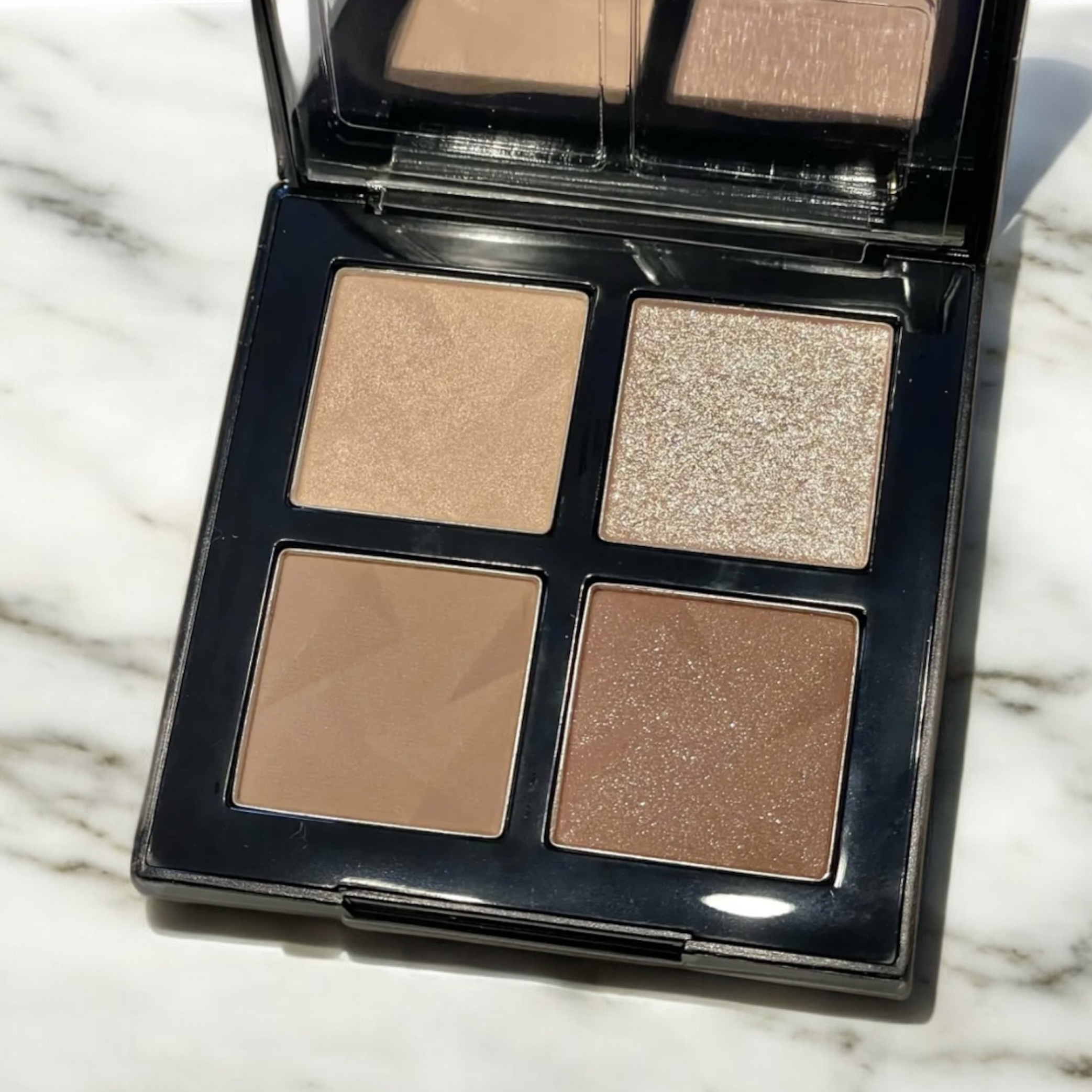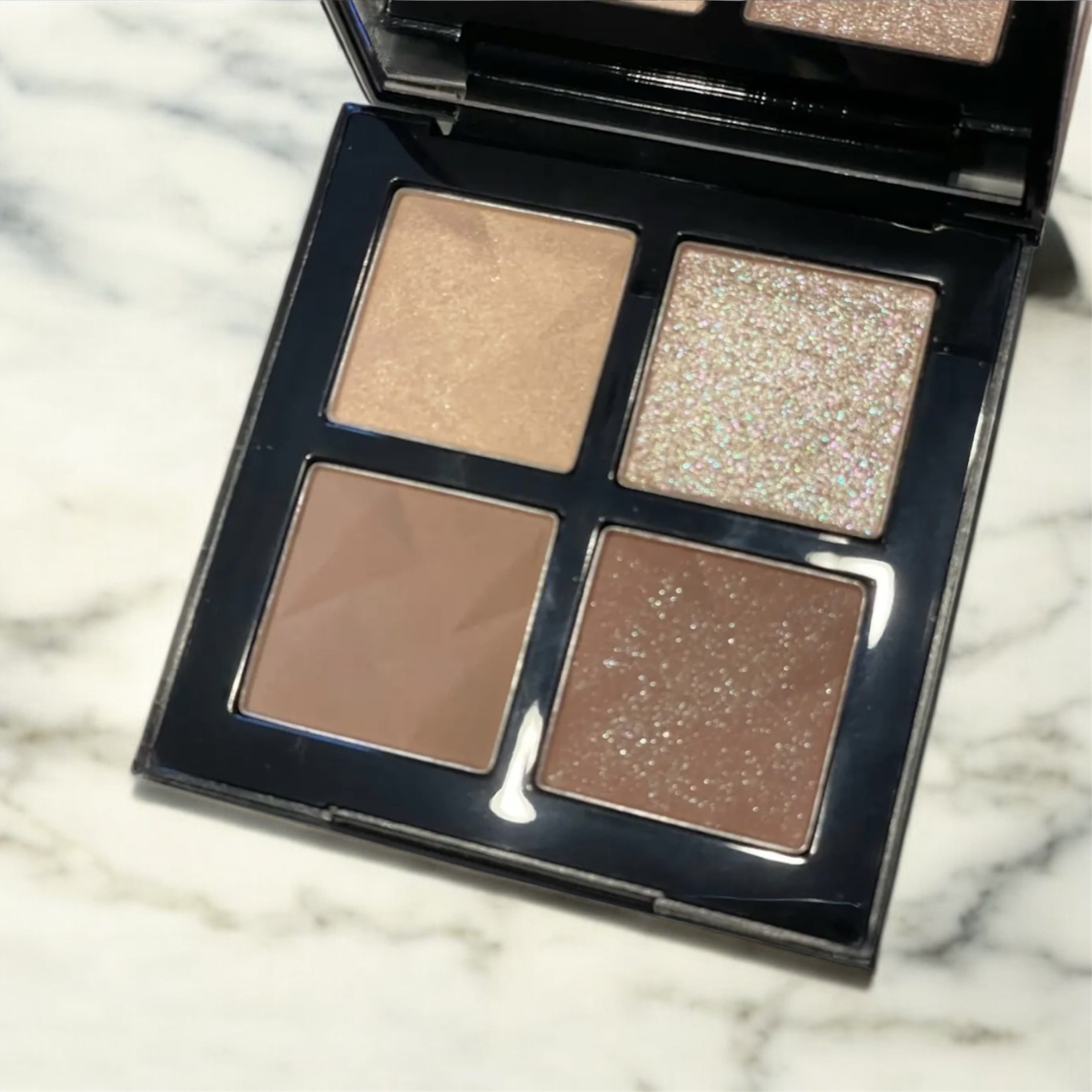 温かみのあるブラウンが揃った使いやすいアイシャドウパレット。 マット3色とパールグリッター1色が含まれ、肌なじみ良く失敗しにくいため、ナチュラルメイクから濃いめのメイクまで幅広く対応できます。 左上のベージュ系ブラウンはベースに、右上の中間色のソフトブラウンはこっくりめのメイクに、左下のベージュ系のパールグリッターは派手すぎない華やかな印象に、右下のダークブラウンカラーは締め色にも使えます。 ラメは若干飛ぶため、アイシャドウベースを仕込むのがおすすめです。 迷った時はこのブラウンを使うとどんなシーンでも合うため、おすすめです。