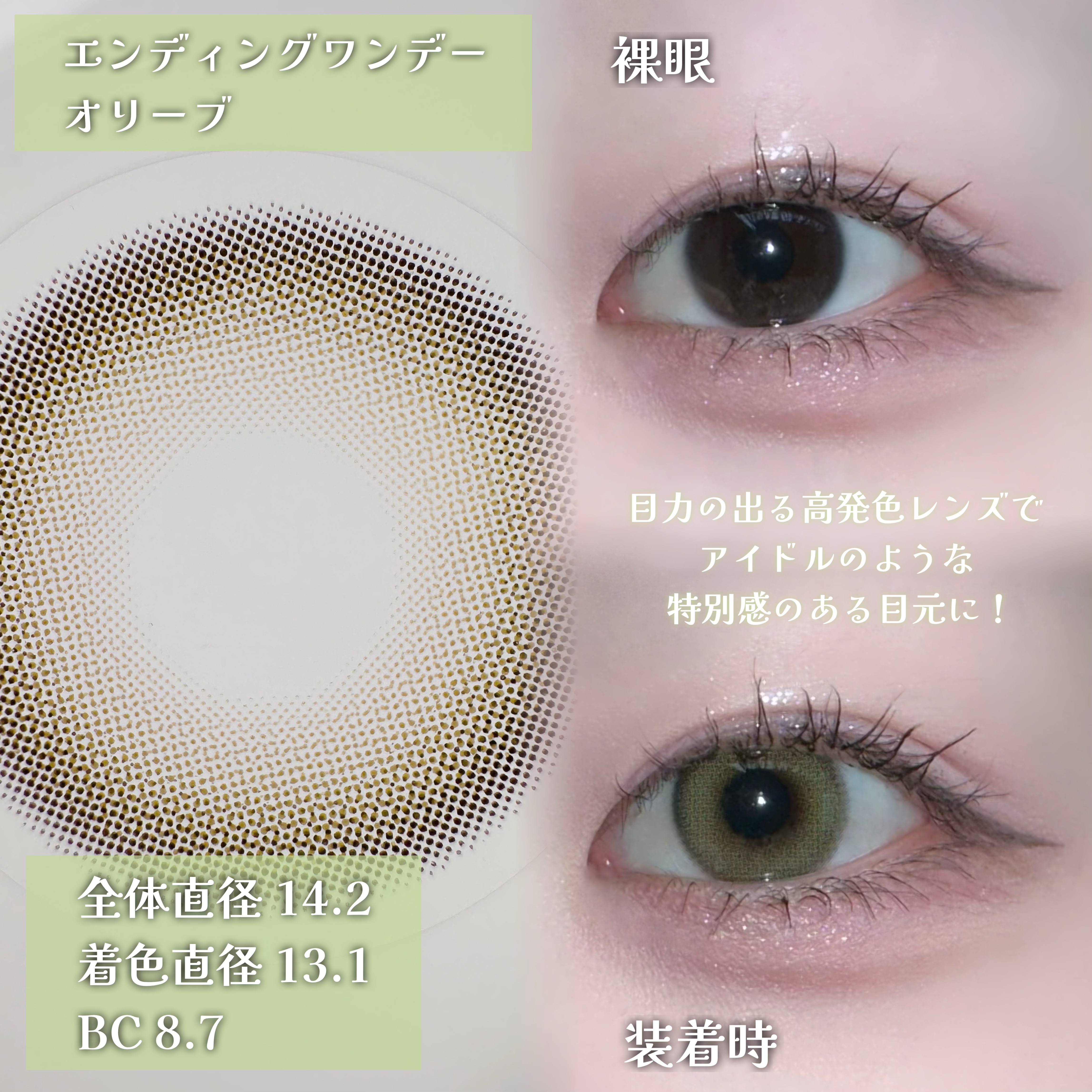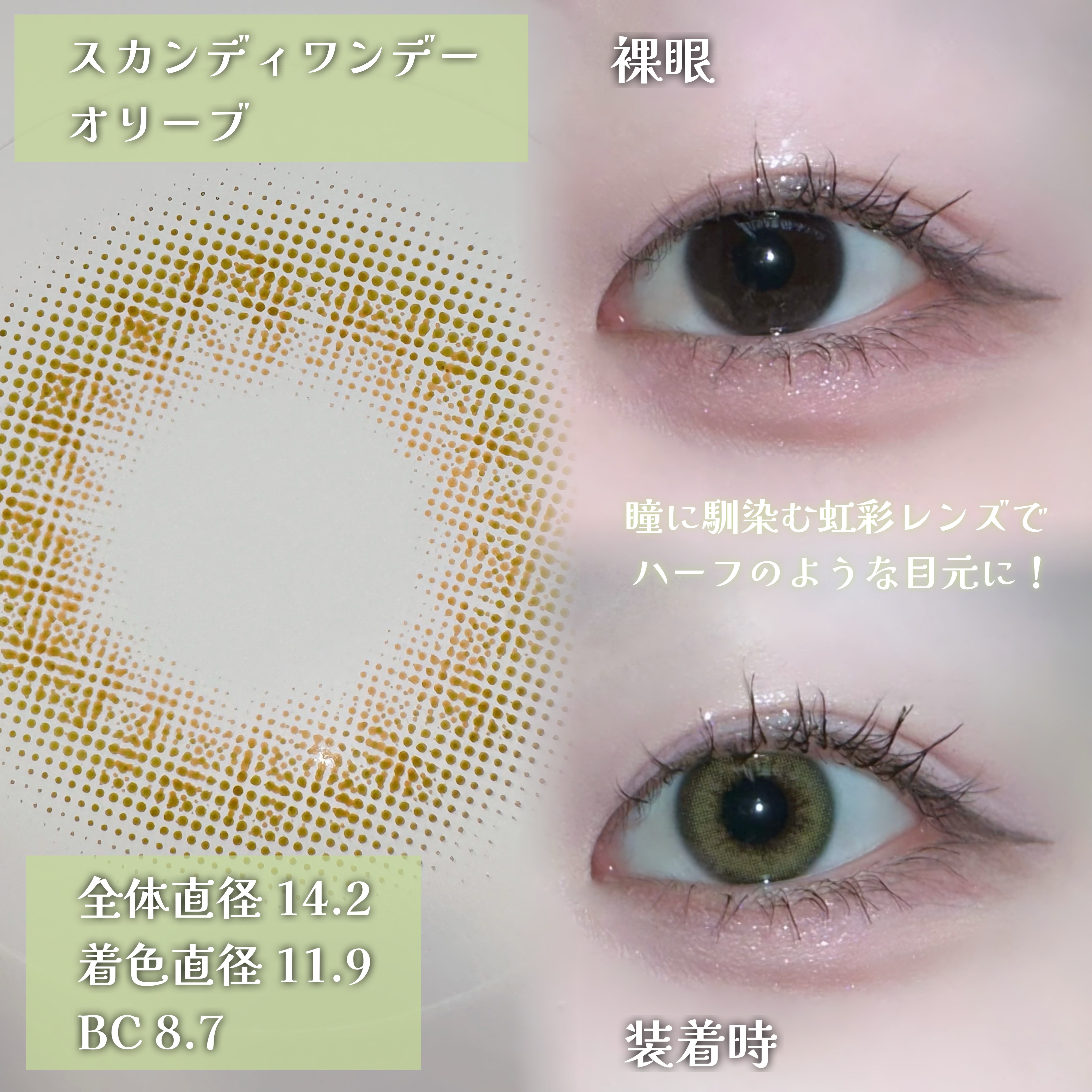 オリーブカラーは意外と馴染みが良くて グレー🩶カラーよりも浮かないので普段使いもしやすくオススメです💁♀️ 1番ナチュラルはGlowy Golden Olive 2番目はEnding リアルなハーフ顔にはスカンディ 気になった方はぜひチェックしてみてください!