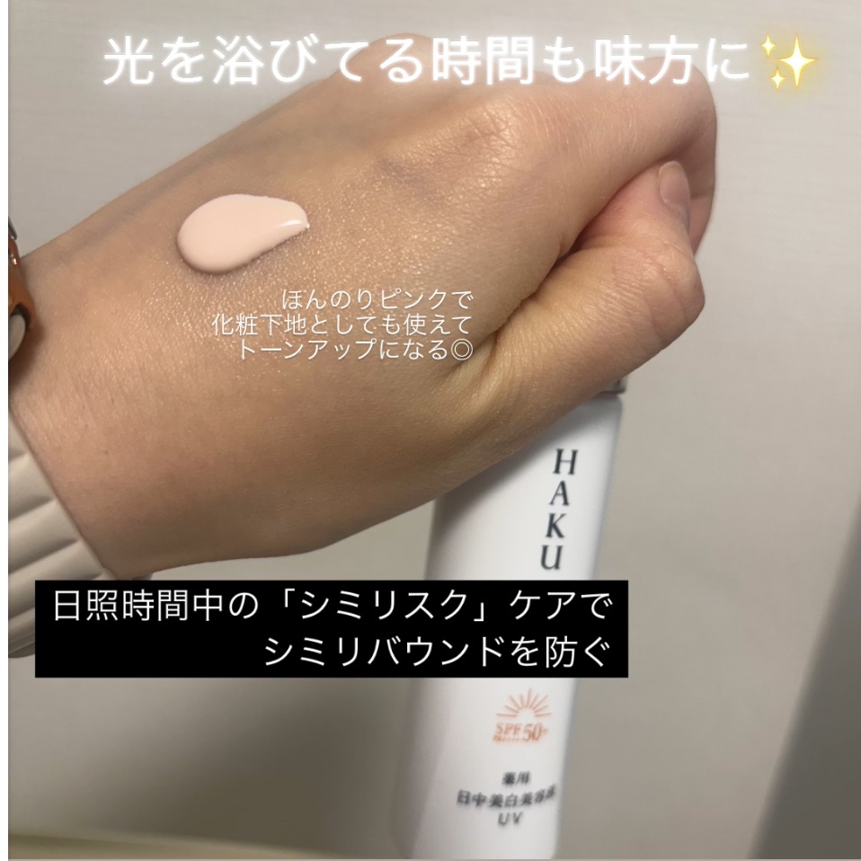 - 販売名「メラノフォーカスUV」 SPF50+・PA++++ 日中のHAKU。光を浴びる時間も味方に、日中だからできる美白ケアのアプローチ。 シミ予防研究の先端技術を搭載し、日中ならではの美白ケアを可能にした、薬用日中美白美容液です。光を浴びる時間も味方にして、明るく透明感のある肌に導きます。 ○2種の美白有効成分を肌の奥まで届け効かせる。 ○日中の肌環境に着目し、Wデイエフェクターを配合。うるおいを与え届ける。 〇ファインレッドパールαが効果的に光を放ち、シミや色ムラを目立たせない。トーンアップ効果で、明るく透明感のある仕上がり。 〇みずみずしい美容液がスーッとなじむ。化粧下地としても使える。 ○無香料・アレルギーテスト済み・ニキビのもとになりにくい処方。 (全てのかたにアレルギーが起きない、ニキビができないというわけではありません)。