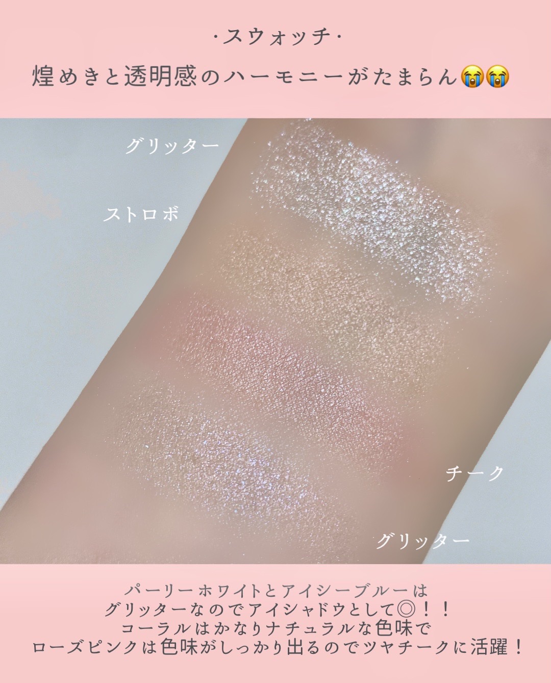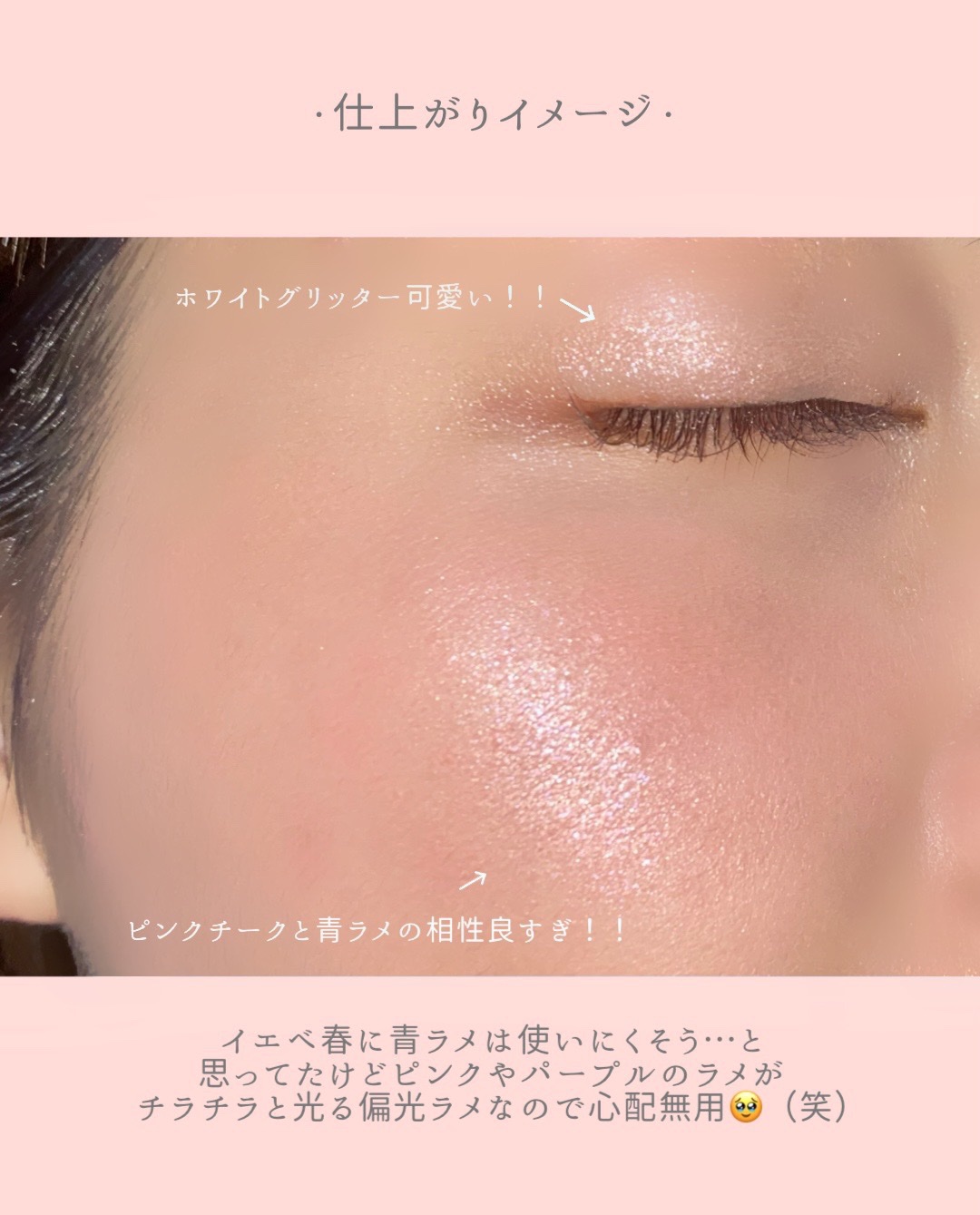 他のアイドルちゃんも愛用している子が多いんです🥹🫶🏻💗 ベージュ×シルバーなどの多色ラメで構成されたザックザクの高輝度ラメ! さっと塗るだけで一瞬で可愛い目元になれちゃうので私も気に入ってます🥰