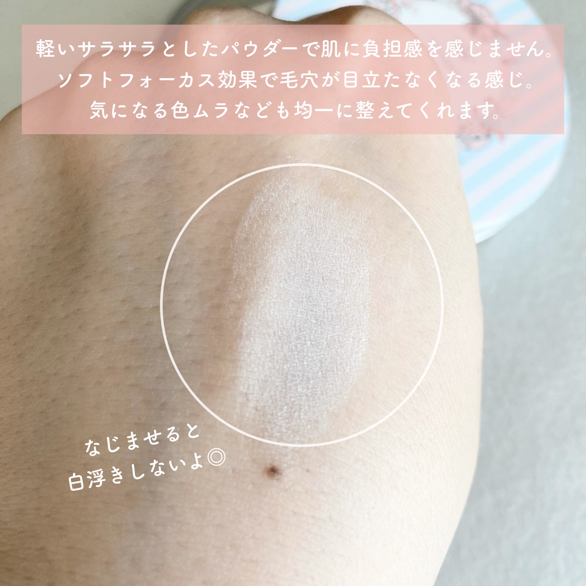 洗顔料でオフできるお肌にやさしい使い心地でメイクの仕上げはもちろん、お手入れの後に使用することでスキンケア効果を閉じ込めてくれる万能パウダー♡ 毛穴に対しての効果を更に実感できた!忖度抜きでほんとすごいコレ。 たくさんつけちゃっても本っっ当にとけこむように馴染んでフィルターをかけたみたいに毛穴をほわっとぼかしてくれる!!