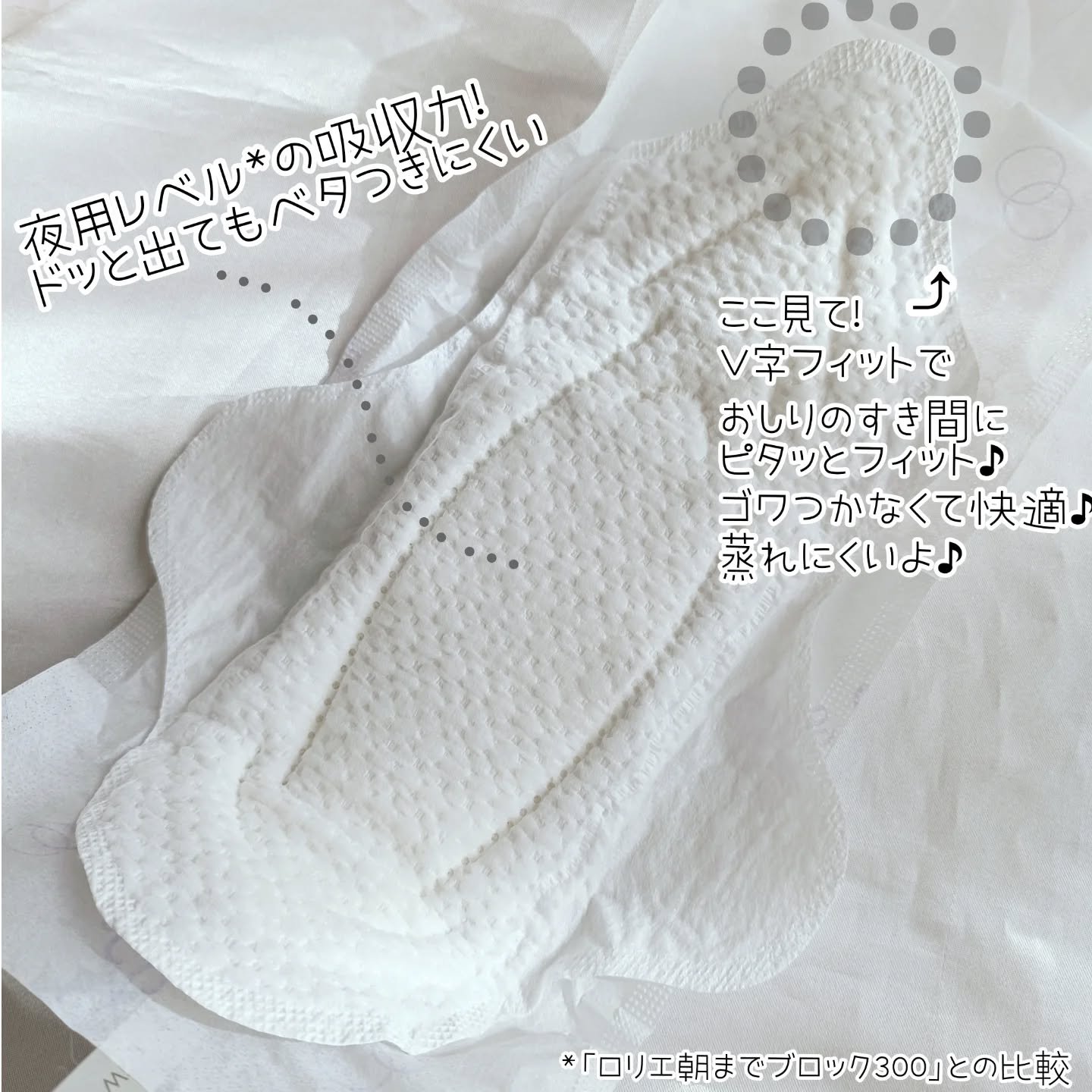 - 新感覚「もちふわクッション」と「V字フィット」がすき間にぴたっと密着 多い日も肌さらつづいてモレにくい ● もちふわクッションがからだに自在にフィット。肌にふわわんとしたつけ心地 ● V字フィットで、おしりのすき間にぴたっ。後ろもゴワつきにくい ● ドッと出ても瞬間吸収し、ベタつきにくく、多い日も肌さらつづく ● 夜用ナプキンレベルの吸収力*1 ● 無香料 *1 当社「ロリエ朝までブロック300」との比較